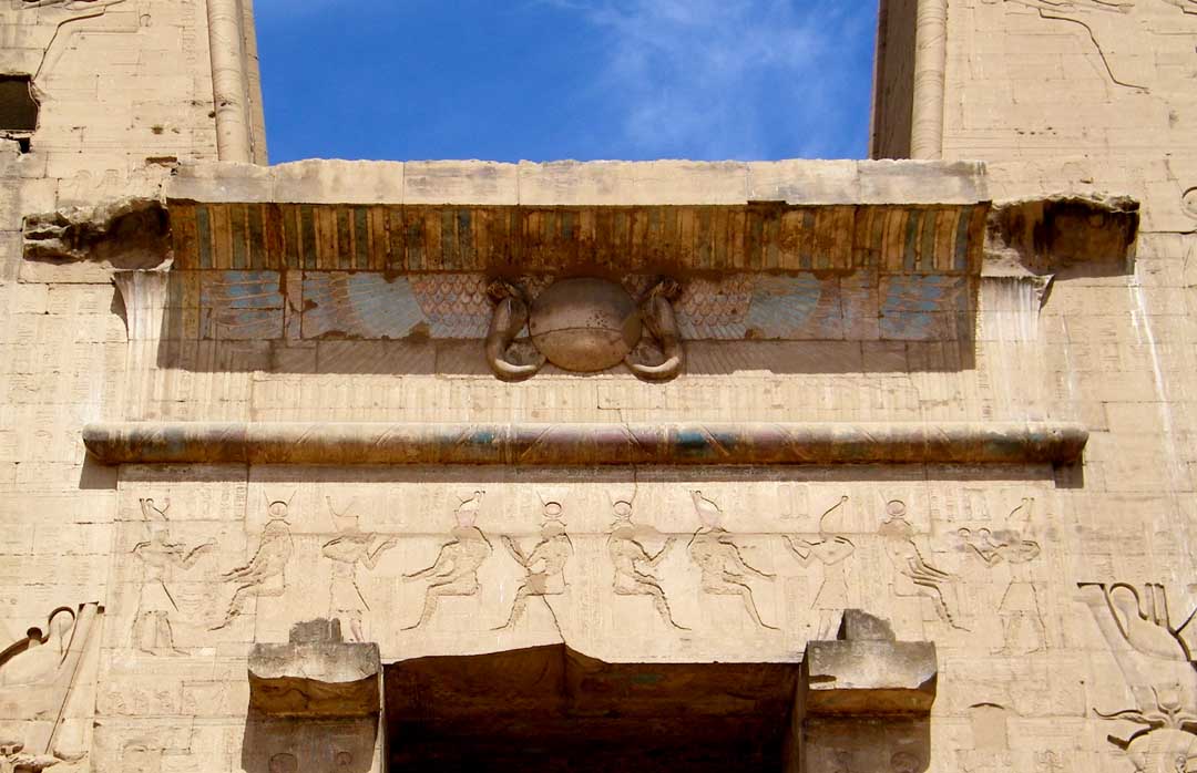 solar disk flanked by 2 cobras and vulture with outspread wings