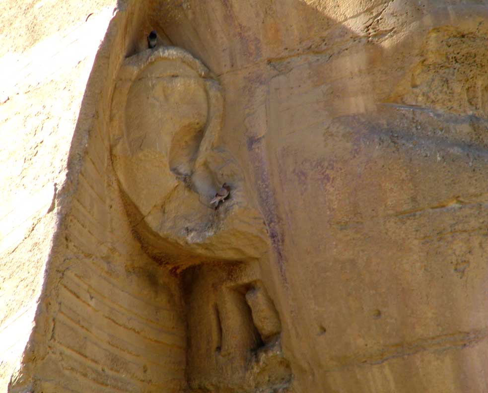 Note birds. The Great Sphinx lies on the east side of the complex, facing east. The shape is that of a reclining lion with a human head. Current consensus among Egyptologists is that the head of the Great Sphinx is that of Khafre. It is the largest monolith statue in the world, standing 241 ft. long, 20 ft. wide, and 65 ft. high. Great Sphinx was built in approximately 2500 B.C. See Wikipedia: Great Sphinx of Giza LARGER SIZE beneath top photo |