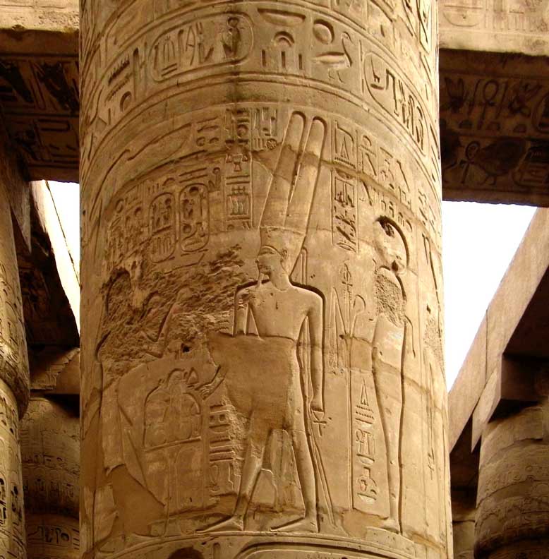 sculpture with hieroglyphic inscription Hieroglyphics: Ancient Egyptian writing which uses pictures for concepts and ideas.. At first picture signs were used to represent objects. Later, the signs came to represent sounds as well. Note the chief Egyptian god Amum-Re who wears a ceremonial beard and on his head a plain, deep circlet from which rise two straight parallel plumes. LARGER SIZE beneath top photo |