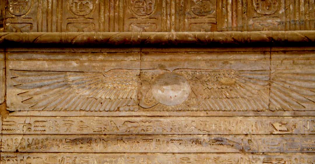 Solar disk flanked by 2 cobras and outspread wings