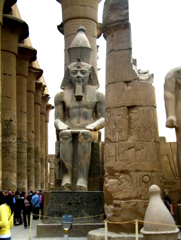 headdress on his head under the crown. From his forehead rises the Uraeus, the portrayal of the goddess Wadjet, who, in the form of a cobra, protected the king. Th straight beard is false. LARGER SIZE beneath top photo |