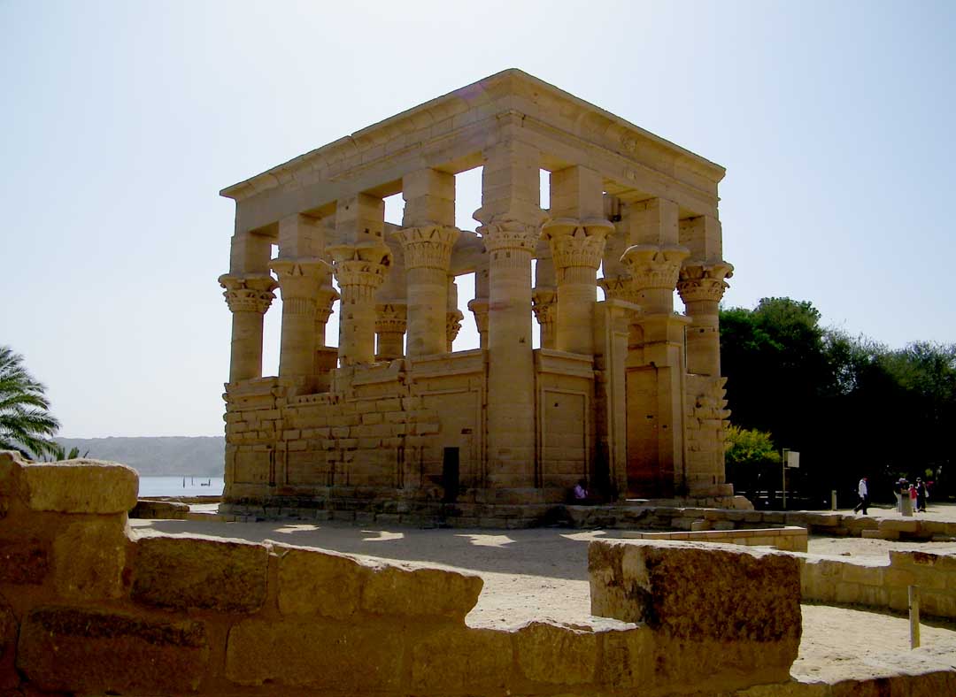 with carved floral capitals. The structure is today roofless, but sockets within the structure's architraves suggest that its roof, which was made of timber, was indeed constructed in ancient times. This building represents an example of the unusual combination of wood and stone in the same architectural structure for an Egyptian temple. LARGER SIZE beneath top photo |