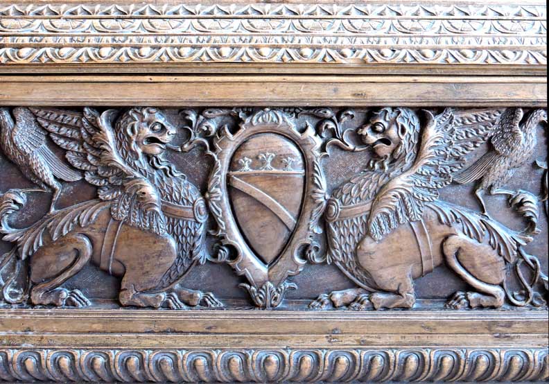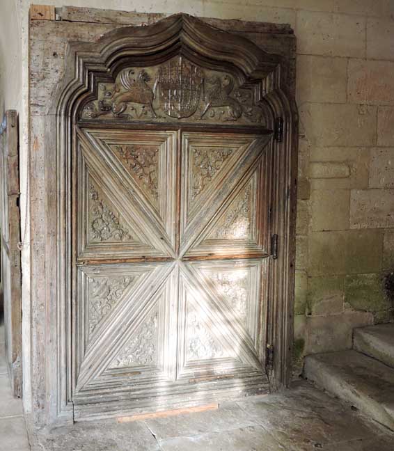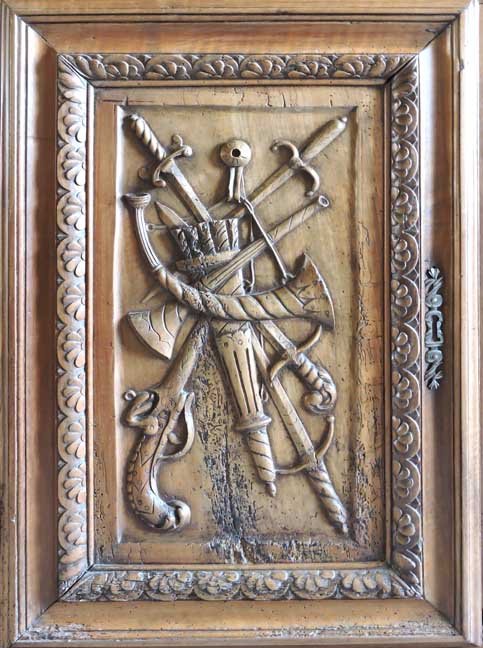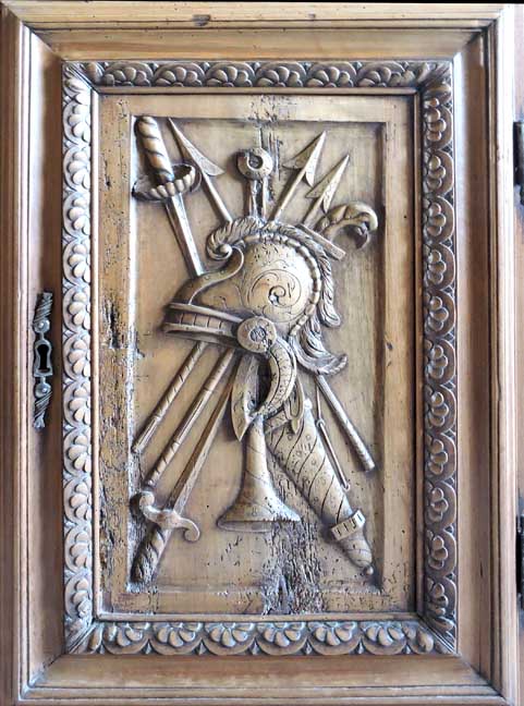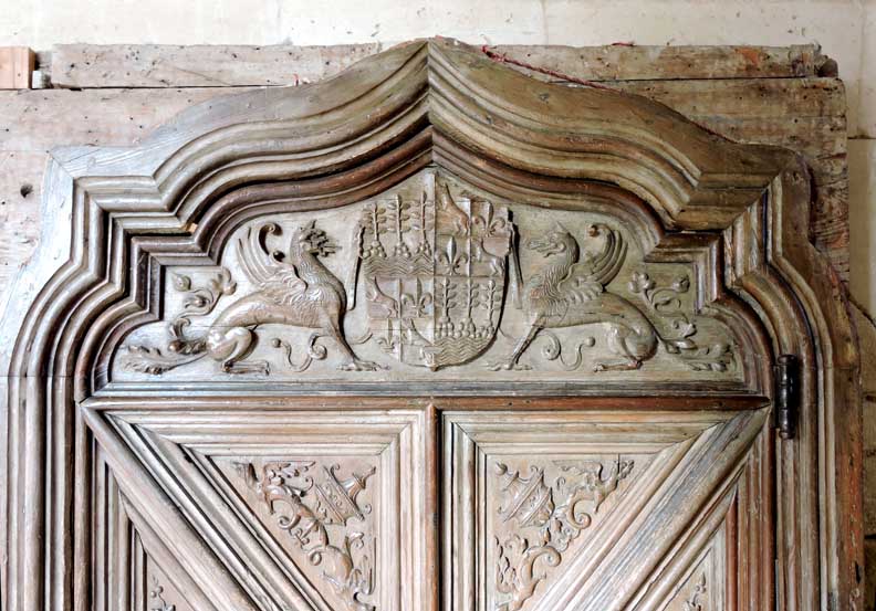 ![]() Paneled door ... Details below: ![]() Griffins flanking a coat of arms that includes fleurs-de-lis ![]() Urns |