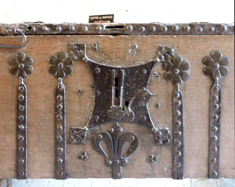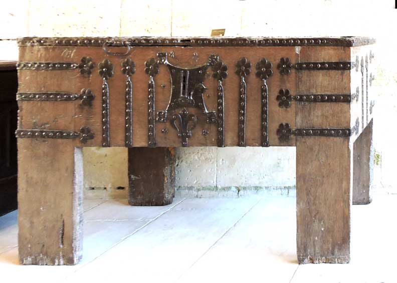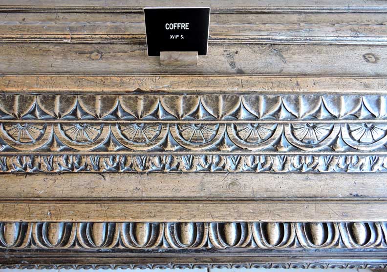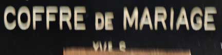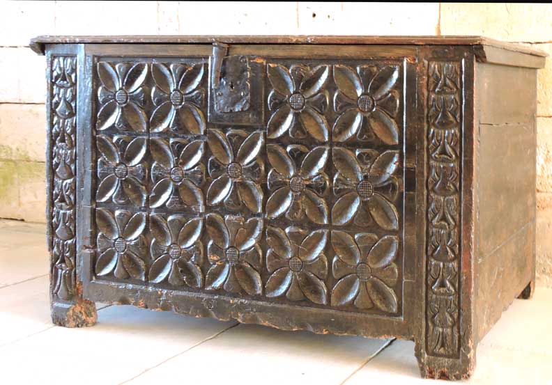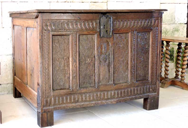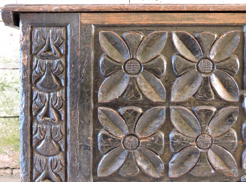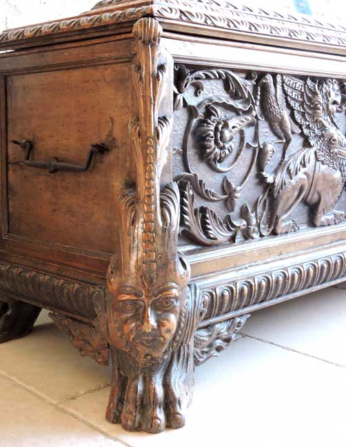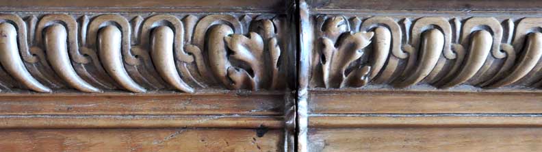 ![]() ![]() 17th Century chest ![]() Leaf-and-dart ![]() Corner grotesque, including lion's paw foot ![]() Lid: Leaf-and-dart molding at top of lid ... Egg-and-dart molding at bottom of lid Front panel: Acanthus leaves ... Phoenix ... Cartouche at far right ... Gadroons at bottom ![]() |