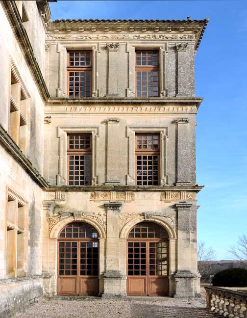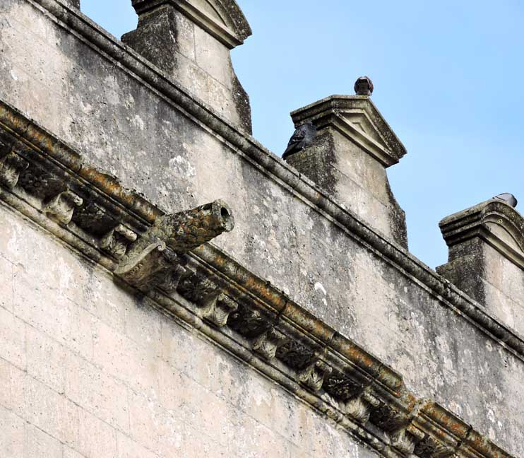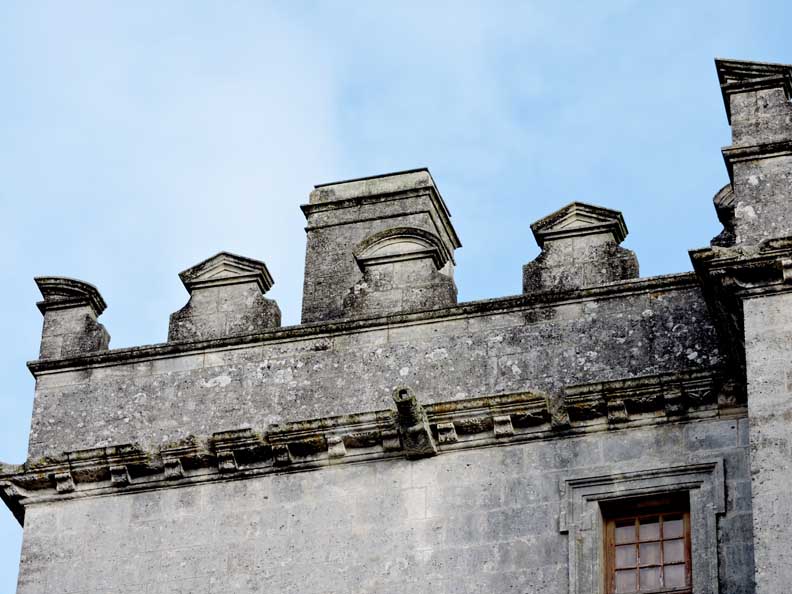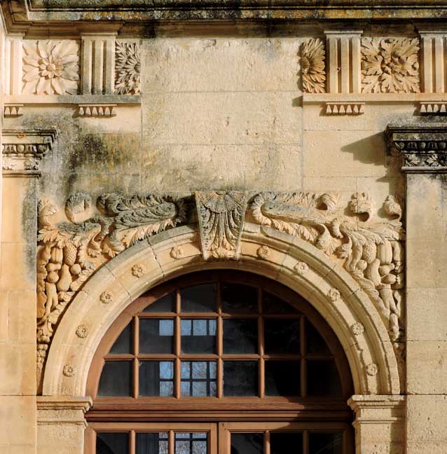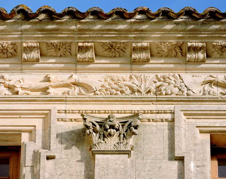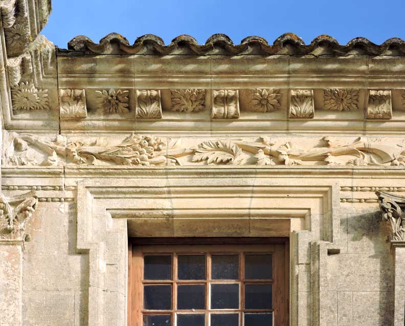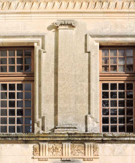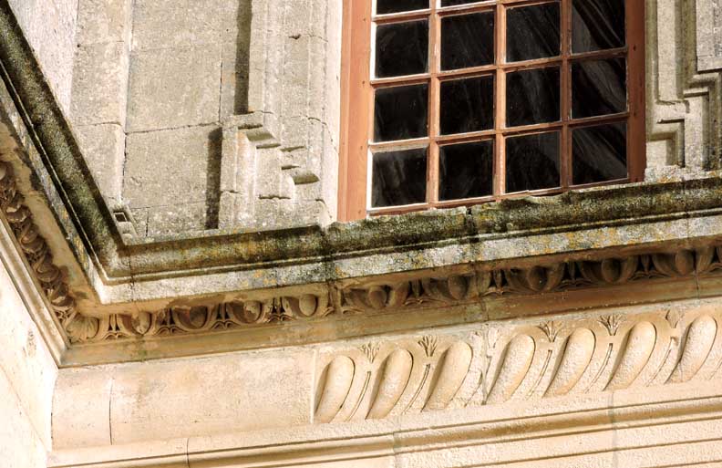 ![]() Note the contrast in styles between the 13th century Gothic castle at the left and the Renaissance palace in the center. ![]() 16th century Renaissance palace ![]() Renaissance crenelation ... Stringcourse above corbels and scupper ![]() Renaissance crenelation ... Stringcourse above corbels and scupper ![]() ![]() ![]() Terra cotta roof tiles ... Cornice with supporting modillions with acanthus leaves carved on outside ... Foliated frieze ... Flanking pilasters ... Bead-and-reel moldings flank the window ... Eared window surround ![]() Terra cotta roof tiles ... Cornice with supporting modillions with acanthus leaves carved on outside ... Foliated frieze ... Flanking CORINTHIAN pilasters ... Bead-and-reel moldings flank the window ... Eared window surround ![]() Gadroons at top ... Ionic pilaster ... Eared window surrounds ... Stringcourse ... Triple triglyphs above guttae ![]() Stringcourse ... Triple triglyphs above guttae ... Pilaster with egg-and-dart and foliated ornamentation ![]() Keystone flanked by foliated spandrels (details below:) ![]() ![]() Foliated spandrels ![]() Keystone ![]() Egg-and-dart molding under stringcourse ... Gadroons ![]() Balusters (The balustrade is undoubtedly a Renaissance, especially 14th century Florence, invention. ) |