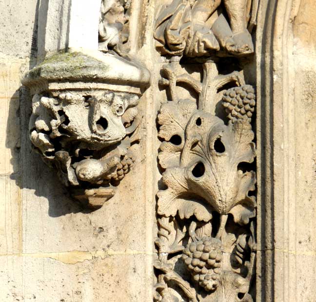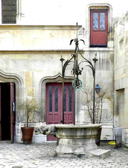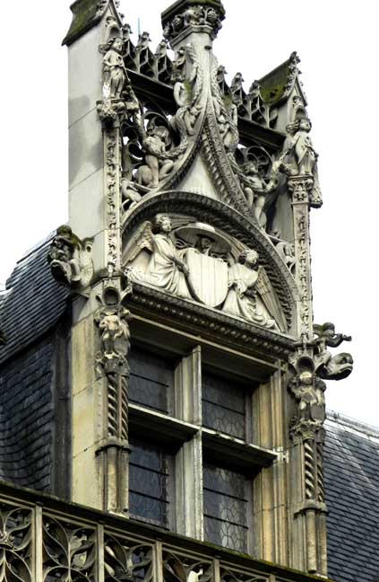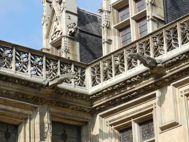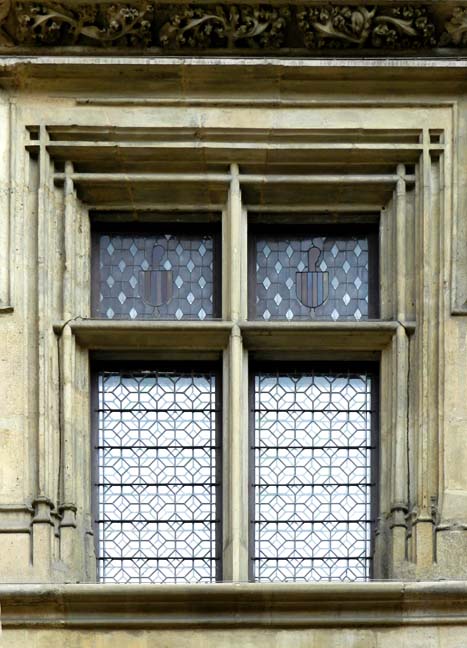 d'Honneur)![]() Cobblestoned Cour d'Honneur (Court of Honor) ![]() Note leaded glass windows (see next photo below) ![]() Stone window surround. ![]() French flamboyant, "flaming." The name derives from the flame-like windings of its tracery - see especially the balustrade - and the dramatic lengthening of gables ..... Pinnacles ..... Cartouche ![]() Stone French flamboyant balustrade ..... Gargoyles ![]() Leaded and stained glass window |