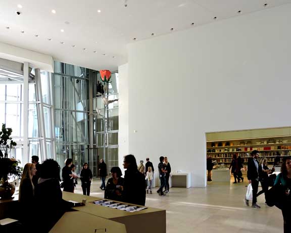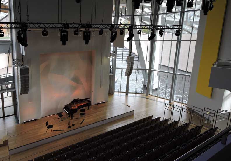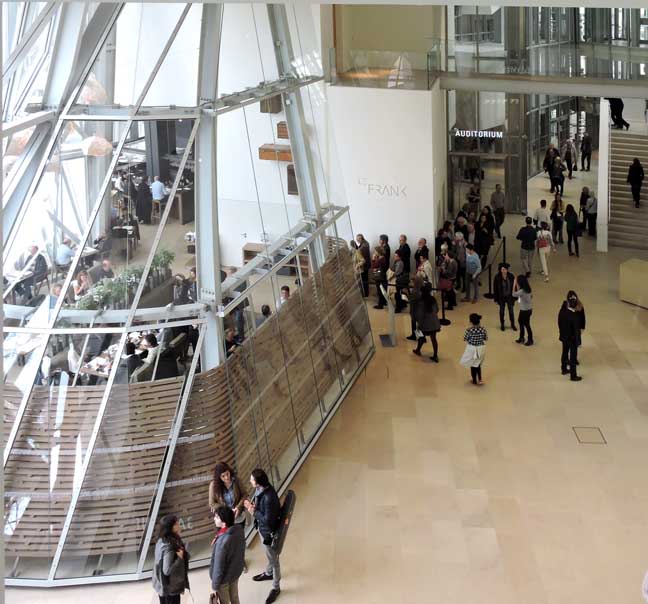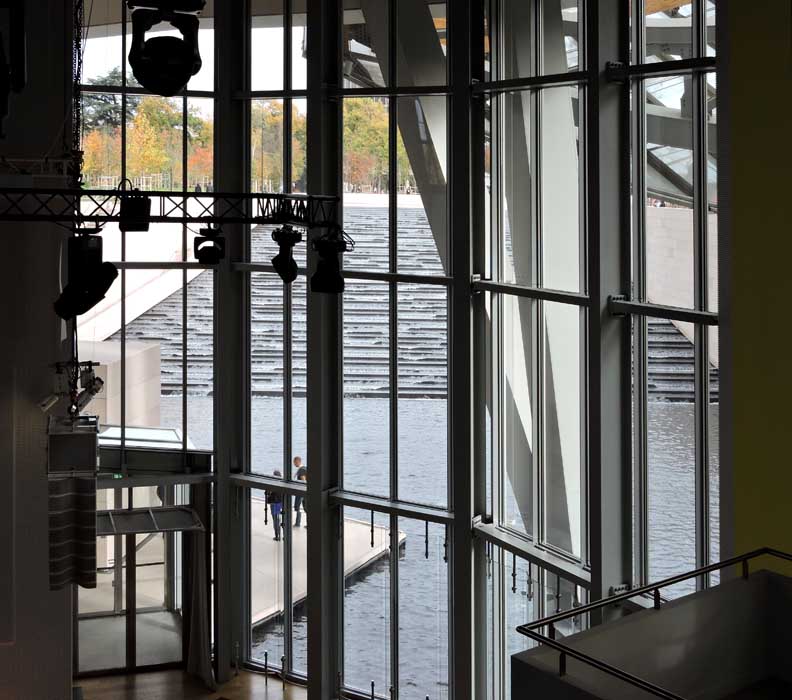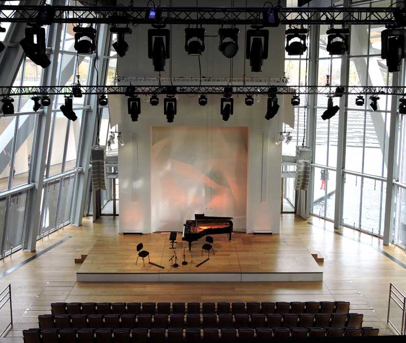" Downstairs, a dazzling concert hall in the “prow” of Gehry’s ship faces the cascade of water just beyond it. The hall is wonderfully mobile—the seating (for 350 people) can disappear into the flooring; the raised stage can also vanish, and a sliding rear wall can open onto an adjoining gallery, creating a vast space for performance art, dance, or even the occasional défilé." - Leslie Camhi, Why Paris’s Newest Art Museum - the Fondation Louis Vuitton - Is Like None You’ve Ever Seen, September 9, 2014