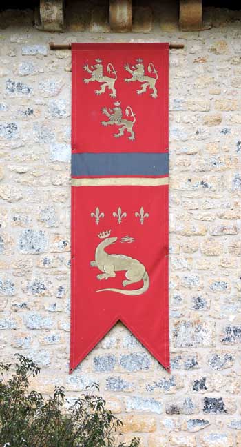 2015 photos ![]() ![]() Note the two terraces near top and far right ![]() ![]() ![]() Note the red banners (one detailed below:) ![]() The salamander in the lower half is a reference to Francois I whose emblem was the salamander. See Francis I Gallery - Fontainebleau Palace ... Fleurs-de-lis are commonly associated with French royalty ![]() ![]() Originally built as a secure defensible fortification from which the lord of the manor could watch over his property and protect it from raiders, the castle now sits quietly above the river valley offering grand views. ![]() ![]() ![]() ![]() |