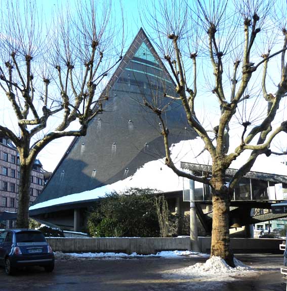 The 1979 modern style [Expressionist] church Sainte-Jeanne d'Arc and the adjacent market [ Place du Vieux-Marché] halls were designed by the architect Louis Arretche. The sweeping curves of the structure are meant to evoke both the flames that consumed Joan of Arc and an overturned Viking ship. Many early christian churches were designed in the shape of an overturned boat. - Wikipedia (April 2012)