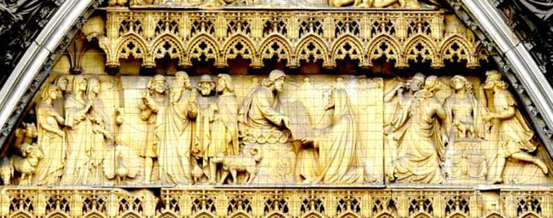 Compound arches ... Archivolts, (ornamental moldings surrounding the arched opening) ... Tympanum ... Jamb statues fanning from the doors ... Details below: