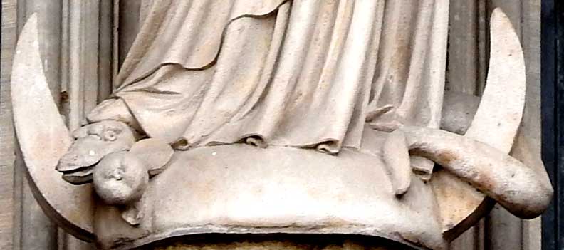 Mary, crowned as Queen of Heaven holding a royal scepter, stands on a crescent moon and a snake symbolizing evil ... 2 details below: