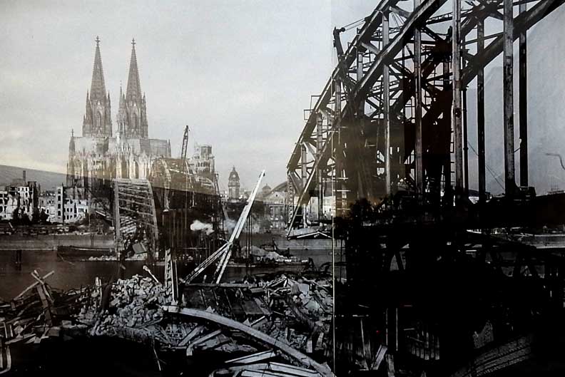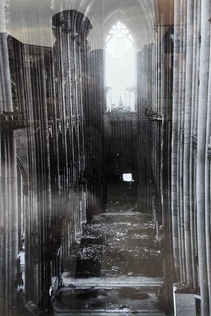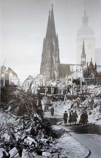 The cathedral suffered fourteen hits by aerial bombs during World War II. Badly damaged, it nevertheless remained standing in an otherwise completely flattened city. The twin spires were an easily recognizable navigational landmark for Allied aircraft bombing.