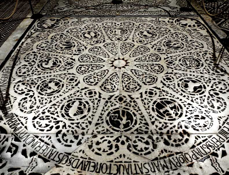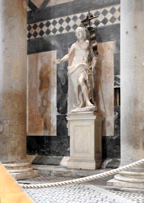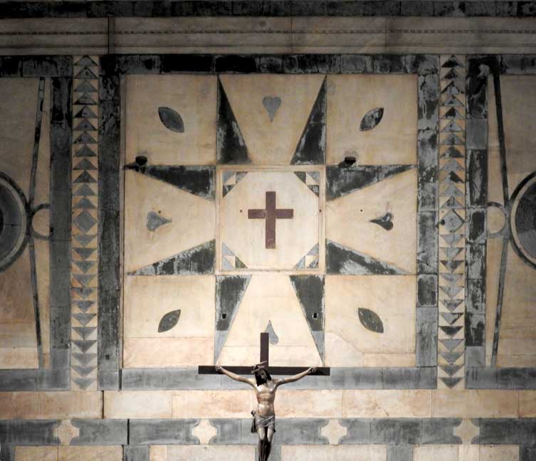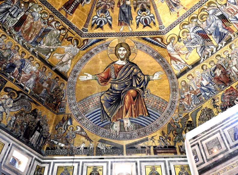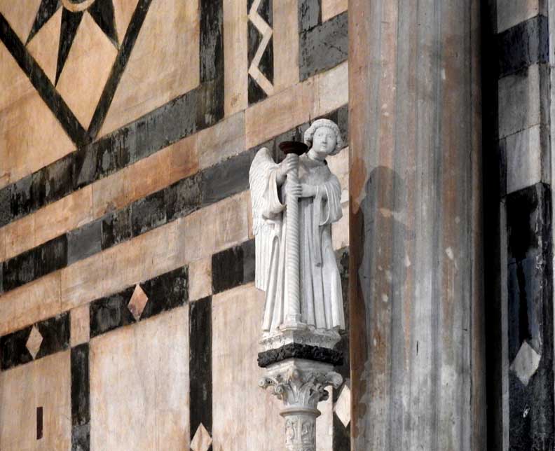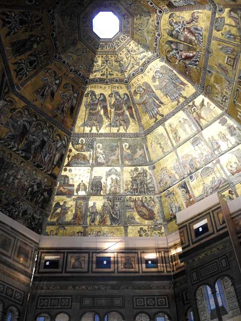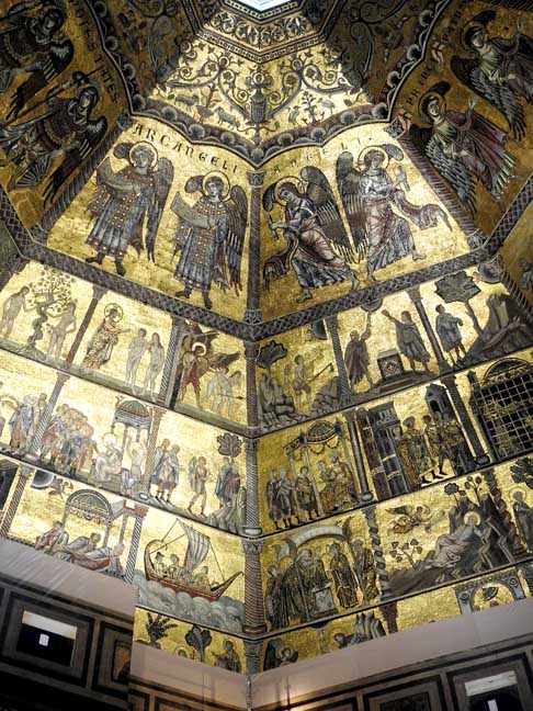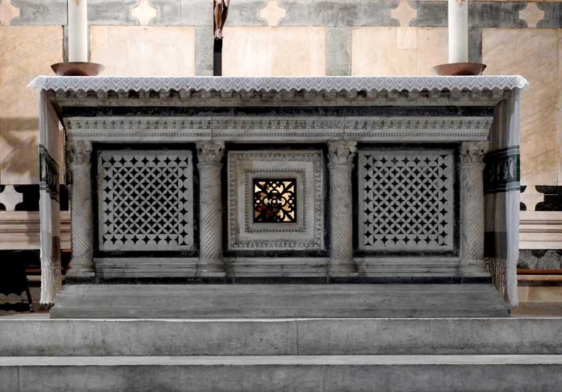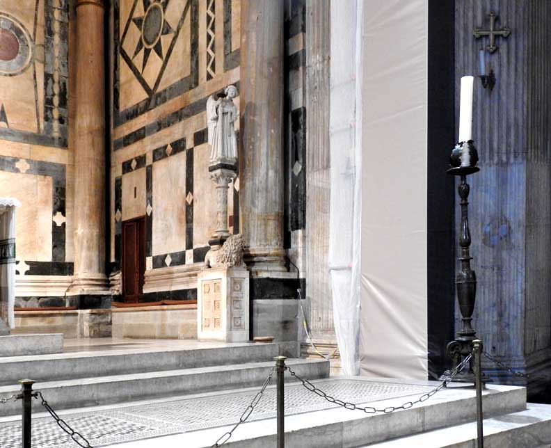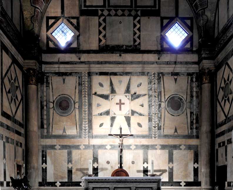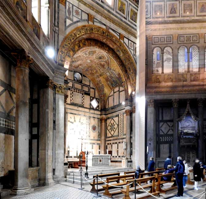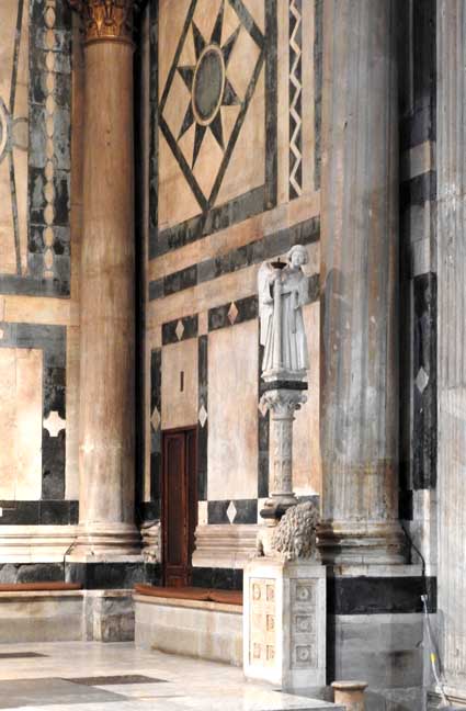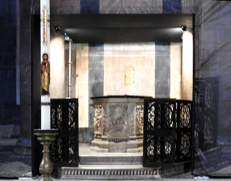 Octagonal baptismal font stands near the south entrance. It was installed in 1658 but is probably much older. ... The original font was installed in the middle of the building in 1128, but removed in 1571 on orders from the grand duke Francesco I de' Medici.