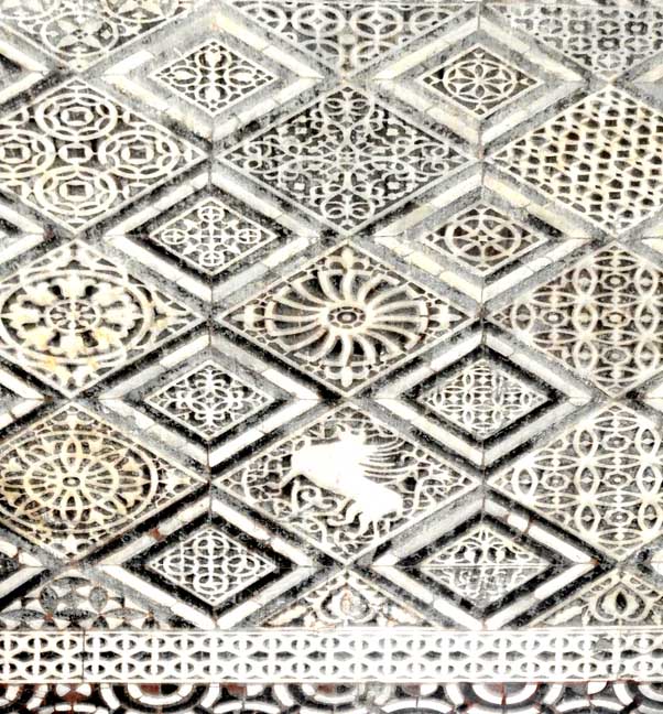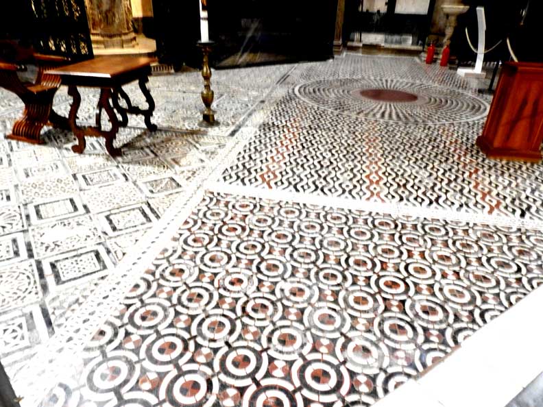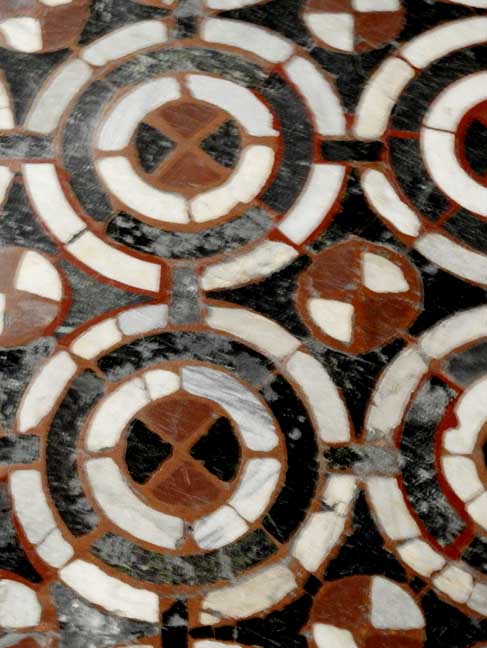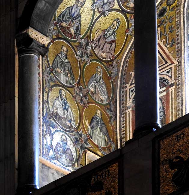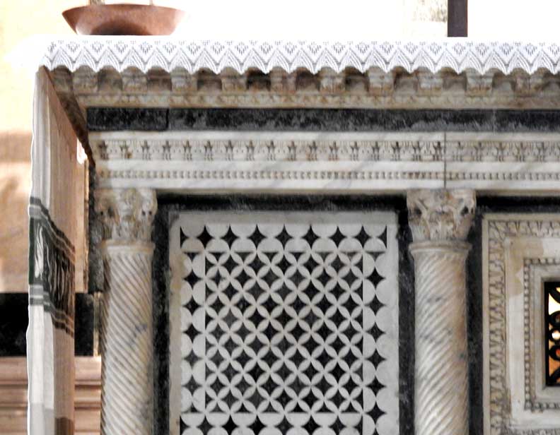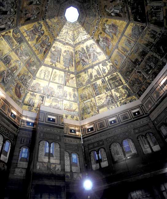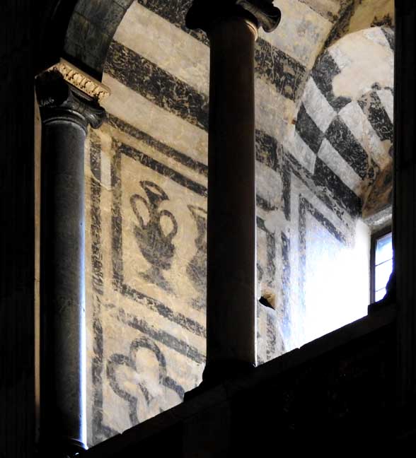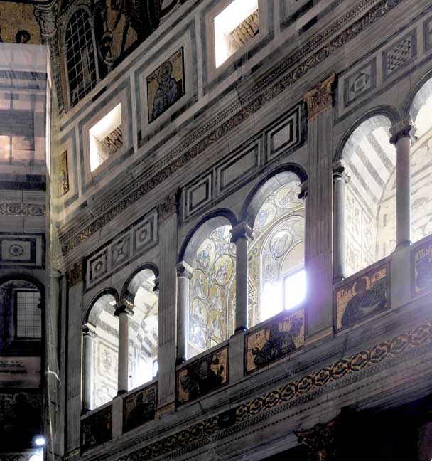 Upper part of the building, below the mosaic dome ... Walkway that continues around the building ... Columns of Sardinian granite ... Light from the three windows located in each of the eight bays