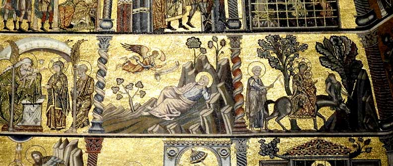 Bottom row: Stories of Virgin Mary and Jesus: Presentation of the of the Infant Jesus in the Temple(?) ... Angel appears to Joseph in a dream(?) ... Flight into Egypt