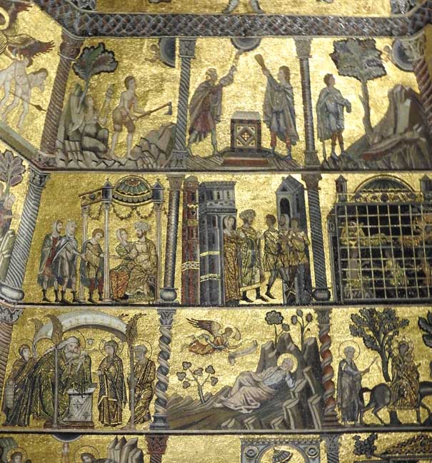 Bottom row: Stories of Virgin Mary and Jesus: Adoration of the Magi ... Garden of Gethsemane(?) ... Walking on Water and Saving Peter(?)
