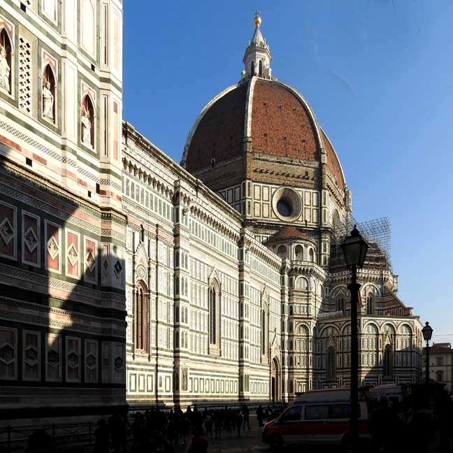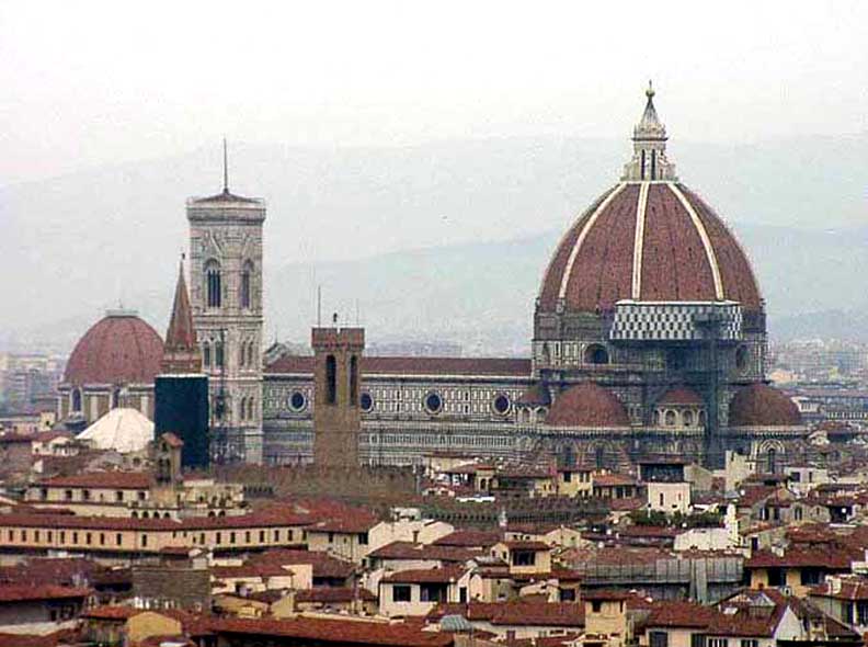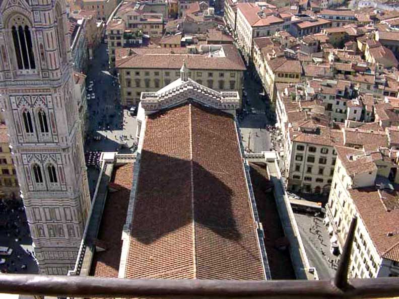 ![]() South elevation Far left dome: Baptistery ... Tall tower towards left: Campanile/Bell tower ... The shorter tower is part of the Palazzo Vecchio ... Work started on the Cathedral dome in 1420 and was completed in 1436 ... The altar, located under Brunelleschi's dome, faces the east (Jerusalem) and is in the front of the cathedral ... Opposite the altar is the main entrance in the facade which is the rear of the church. ... "Perhaps the most important part of this church, however, was the part that was not built with the rest of the church [1296-c.1367]. This was the enormous dome which covers the crossing, a dome so large and notable that after it was built, its name came to be synonymous with the church itself (“Il Duomo”). When the church was designed, it was done so by builders who did not know how they could surmount the space of the crossing with a covering. They assumed that it would be covered at a later date as technology or human ingenuity rose to the challenge, but until that happened it remained uncovered for many years. It was not until Filippo Brunelleschi, one of the greatest Renaissance minds, devised a plan to build the dome around 1425 that the crossing was finally covered." - ItalianRenaissance.org (online April 2020) ... See also: Mario Salvadori, Why Buildings Stand Up ![]() Tall tower at left: Campanile ... Nave South elevation on the left ... Note the false front over the cathedral main entrance at rear of the building 2002 photo taken from the dome balcony |