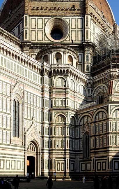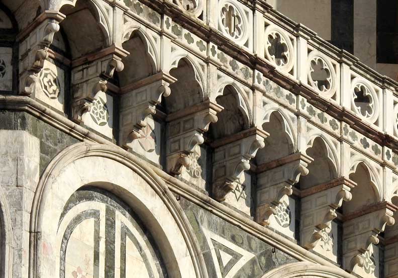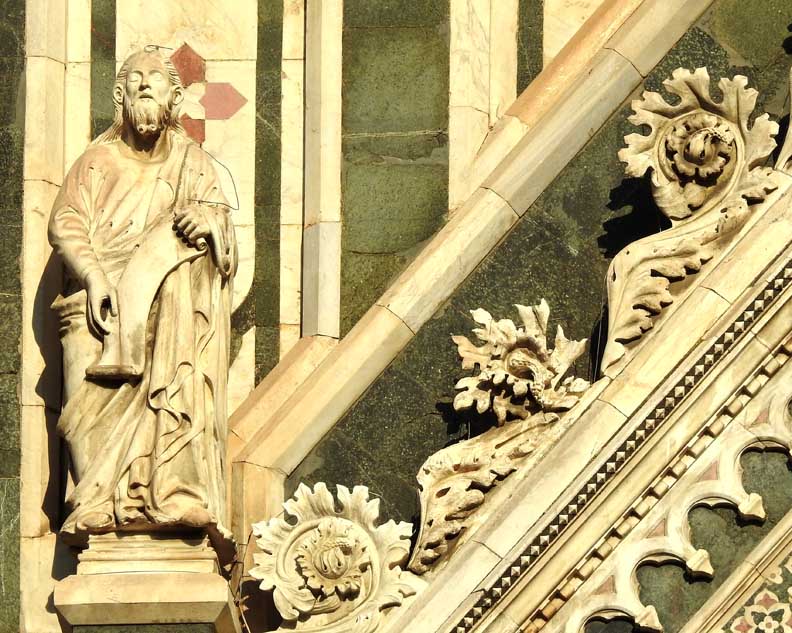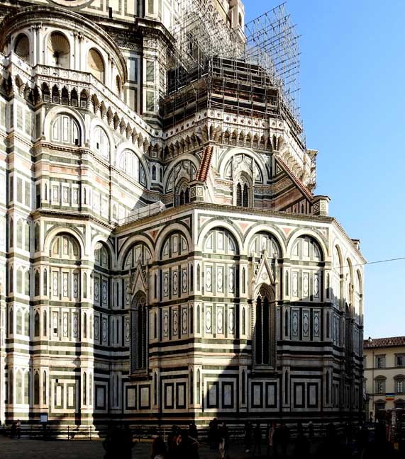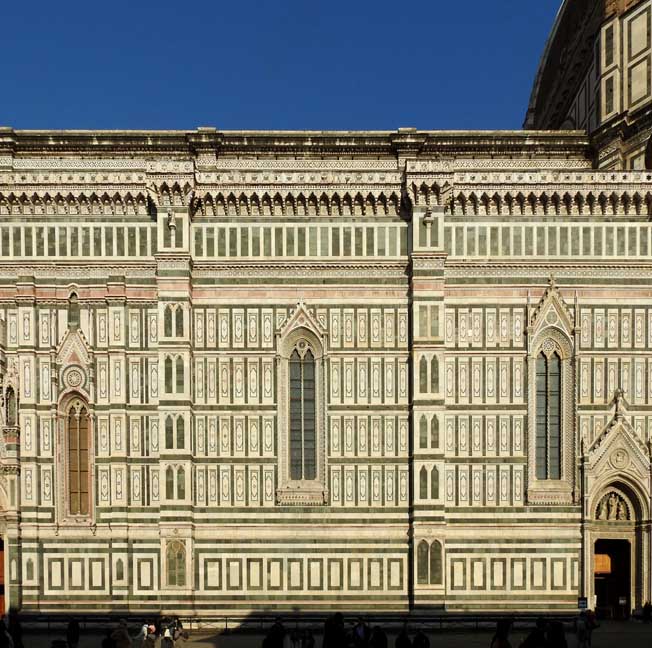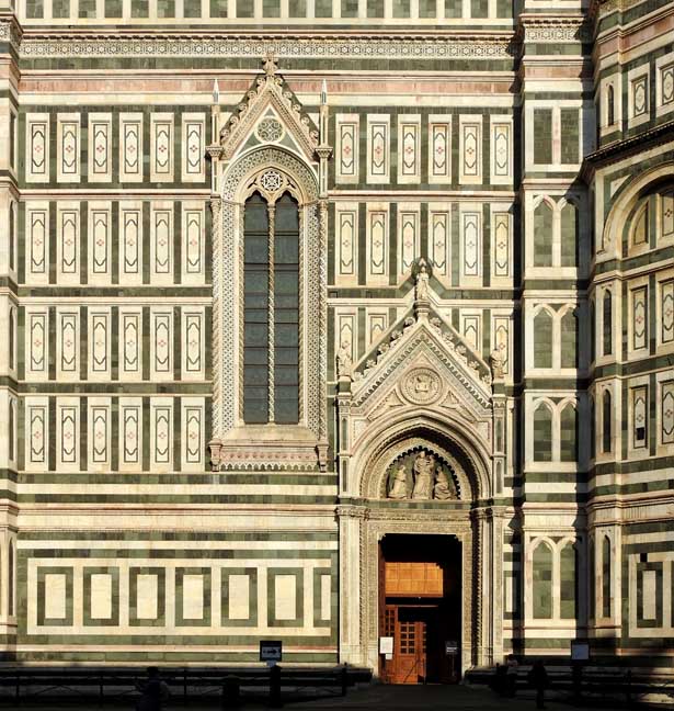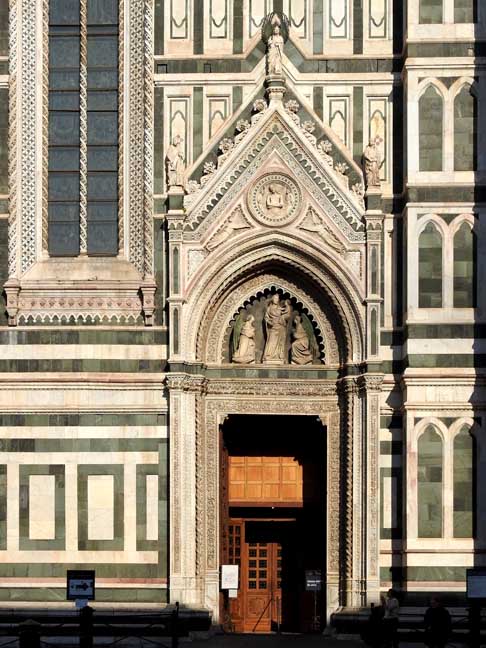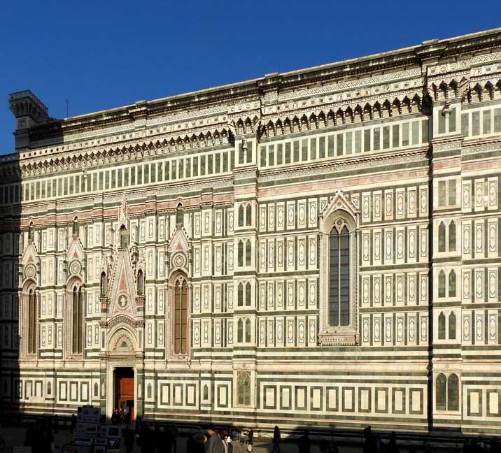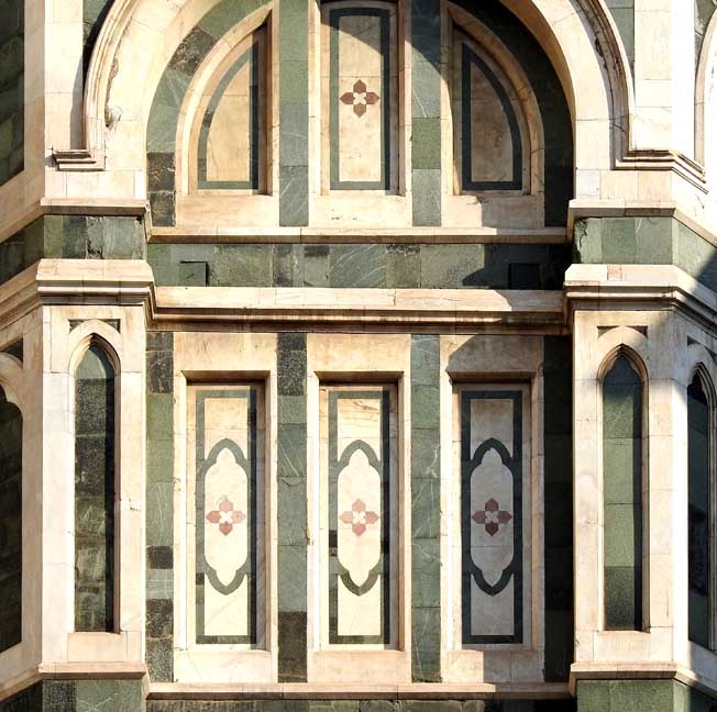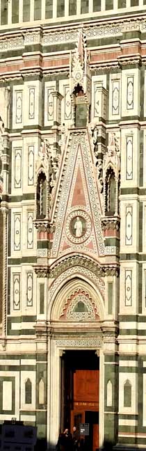 First and second bays ![]() Center building: Campanile/Bell tower ... Right: South elevation of the Cathedral The Cathedral marble bands repeated the already existing bands on the walls of the earlier adjacent baptistery and Giotto's Bell Tower. ![]() South elevation - First and second bays Note bay dividing pilasters ... Note entrance, isolated below: ![]() Three details below: ![]() Entrance detail #1 - Incrustation ![]() Entrance detail #2 - "Christ the Teacher" ... Incrustation ![]() Entrance detail #3 ![]() Gargoyle ![]() Gargoyle |