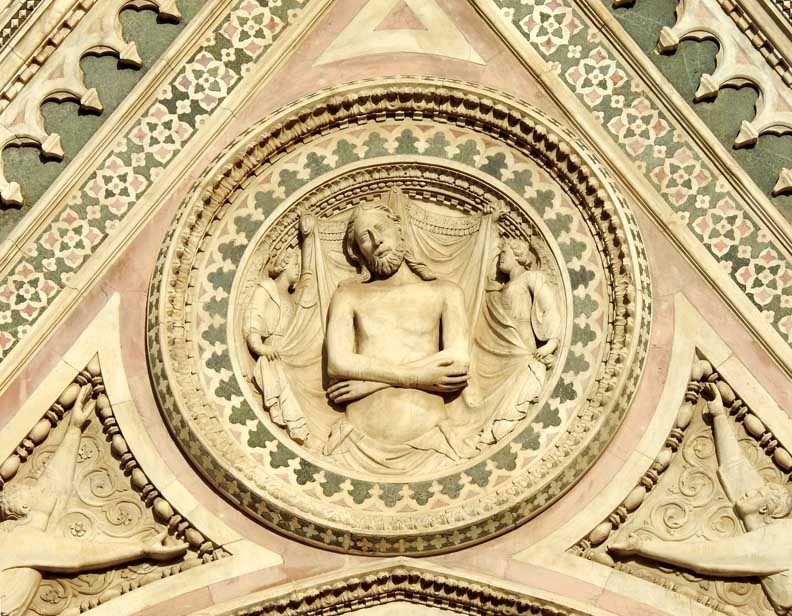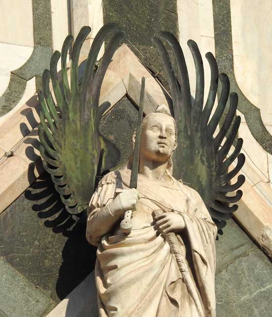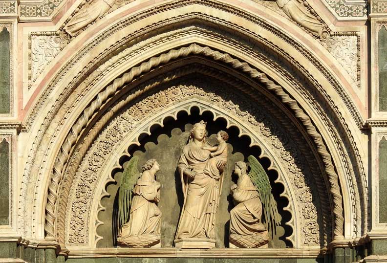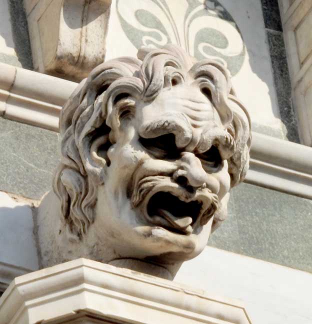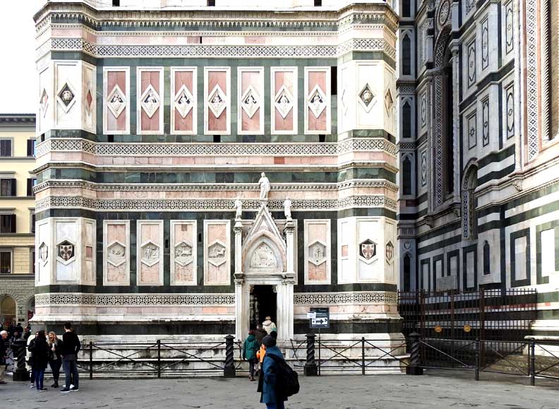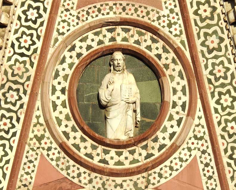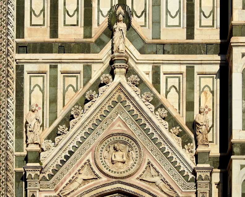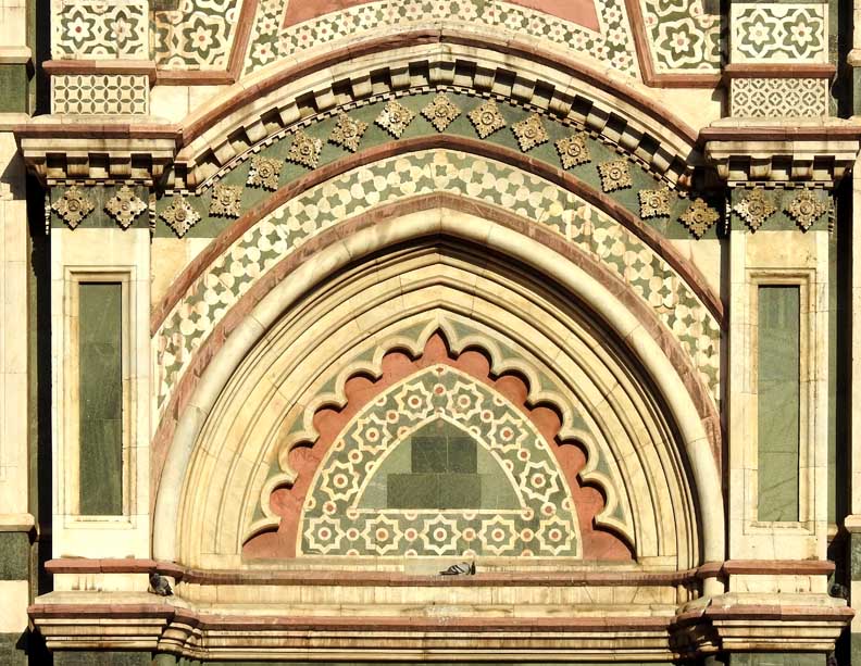 First and second bays ![]() Center building: Campanile/Bell tower ... Right: South elevation of the Cathedral The Cathedral marble bands repeated the already existing bands on the walls of the earlier adjacent baptistery and Giotto's Bell Tower. ![]() South elevation - First and second bays Note bay dividing pilasters ... Note entrance, isolated below: ![]() Three details below: ![]() Entrance detail #1 - Incrustation ![]() Entrance detail #2 - "Christ the Teacher" ... Incrustation ![]() Entrance detail #3 ![]() Gargoyle ![]() Gargoyle |