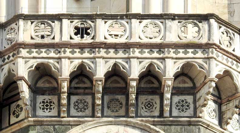 Second south elevation entrance ![]() Second, third and fourth bays ... Dome ... South transept Bay ... Dome ... Transept Tall, left: Campanile/Bell tower - first and second bays not visible because of the angle ... Note entrance, detailed below: ![]() Second, third and fourth bays Note pilasters that separate bays and a second south elevation entrance ![]() ![]() Parapet ... Multifoils ... Corbel table ... Green and white Romanesque style encrusted marble ![]() ![]() Protruding south transept ![]() ![]() ![]() Details below: ![]() Three tympanum details below: ![]() Tympanum detail #1 - Archangel Michael ![]() Tympanum detail #2 ... Evangelist with gospel ... Scrolling acanthus leaves ... Encrusted diamond molding ... Dentil molding(?) ... Corbel table ![]() Tympanum detail #3 - Bas-relief ![]() ![]() Acanthus leaves |