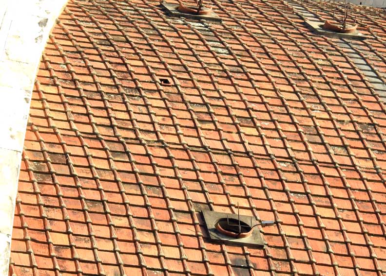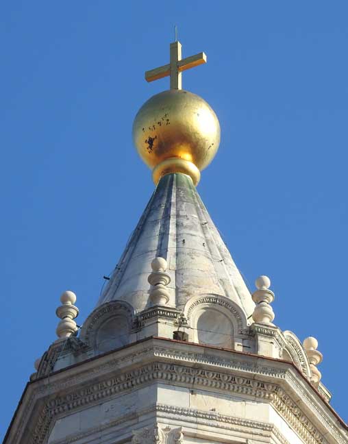 Five details below:![]() Detail #1 - Cross and ball finial ... Lantern conical roof ... Short pinnacles ![]() Detail #2 - Octagonal drum on lantern ![]() Detail #3 - Terra cotta dome tiles ![]() Detail #4 - Lantern ... Ribbed dome ... Unfinished frieze ... Roundel ![]() Detail #5 - Unfinished frieze |