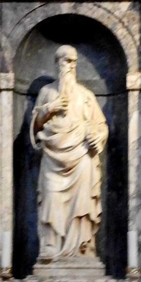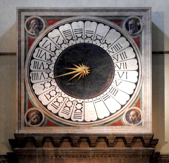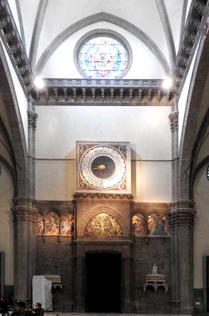 Front entrance of the cathedral ![]() Front entrance of the cathedral Note the relatively plain wall decorations ... Gothic style ![]() Front entrance of the cathedral Three groin vaults ... Three ribs ... The original plan originally called for a timber truss roof, but in the mid-1300s this was changed to a ribbed groin vault ![]() Front entrance of the cathedral ![]() Front entrance of the cathedral 24 hour liturgical clock designed in 1443 by Paolo Uccello in accordance with the ora italica, where the 24th hour of the day ended at sunset ... This timetable was used until the 18th century. This is one of the few clocks from that time that still exist and are in working order. ![]() Front entrance of the cathedral "Coronation of Mary in Heaven" includes center mosaic |