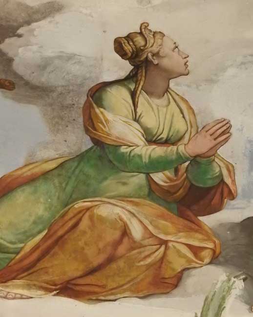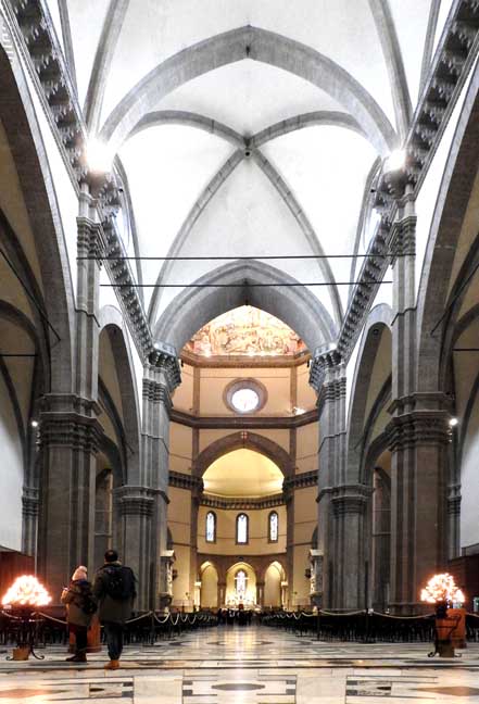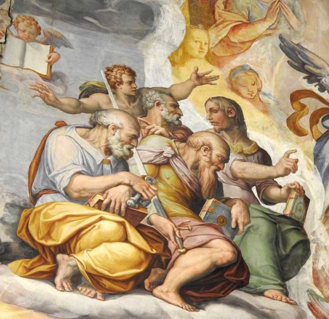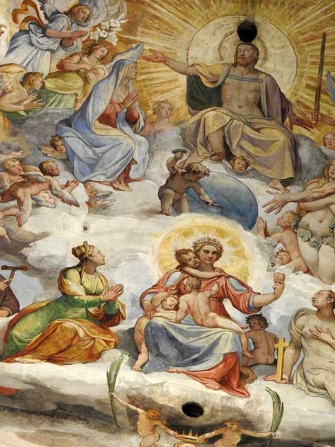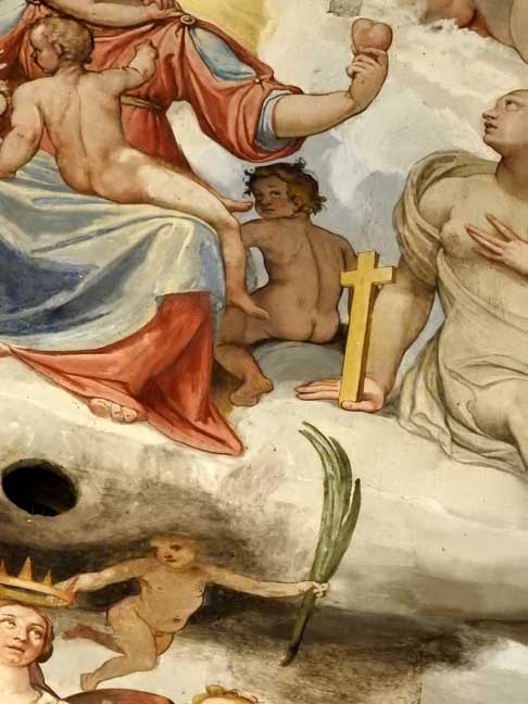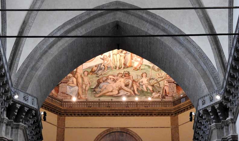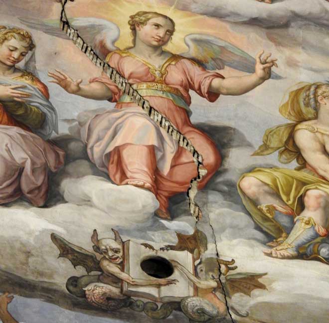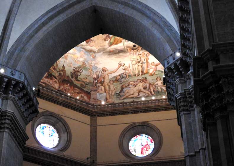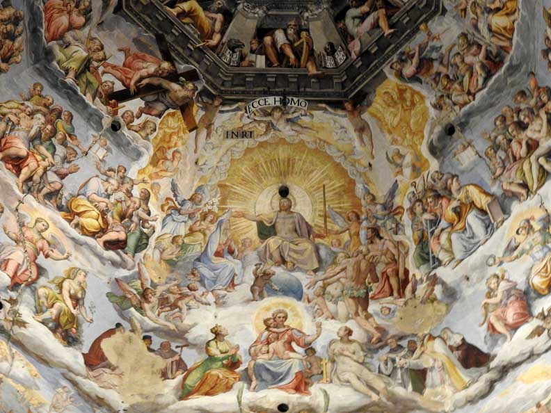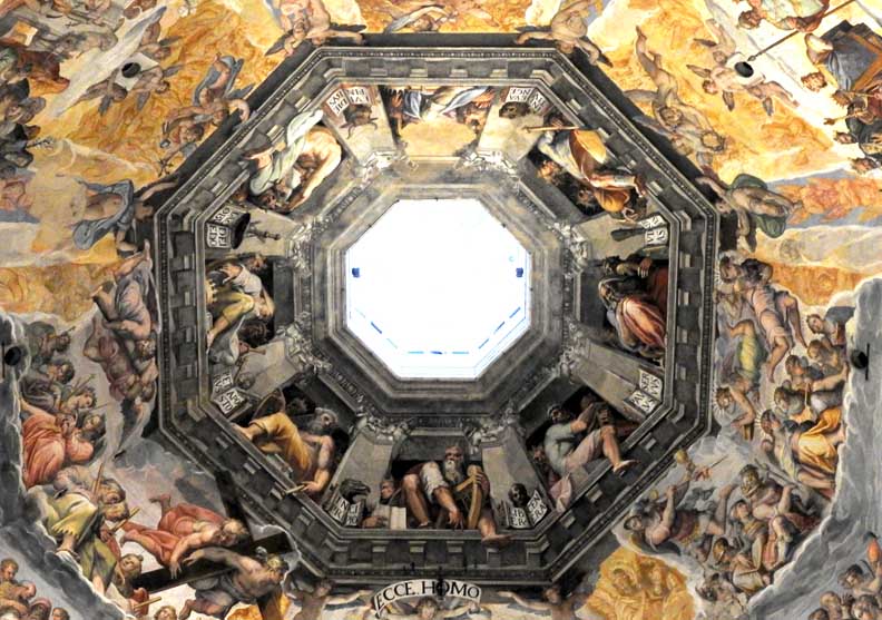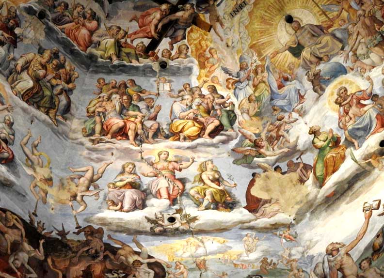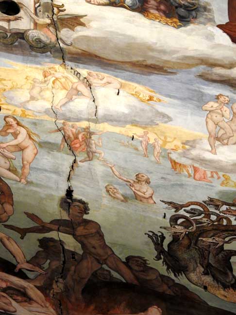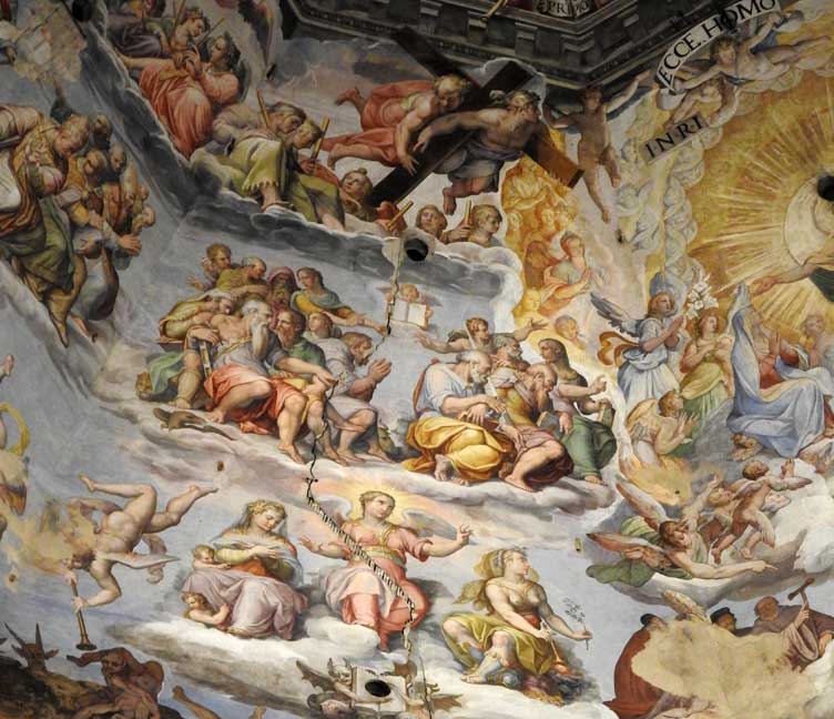 Last Judgment"![]() Nave view toward altar ![]() "The Last Judgment" Inside the dome ![]() "The Last Judgment" Note walkway ![]() "The Last Judgment" The largest artwork in the cathedral is the fresco painted inside the dome designed by Giorgio Vasari in 1568, and completed by Federico Zuccari in 1579. ... Vasari painted using the fresco (painting on wet plaster) technique, but Zuccari painted "in secco" (painting on dry plaster) ... The interior of the cathedral was finished with the completion of the dome artwork. ![]() "The Last Judgment" Daylight from the lantern ... "Ecce Homo" ![]() "The Last Judgment" Heaven ... Four details below: ![]() "The Last Judgment" Detail #1 ![]() "The Last Judgment" Detail #2 ![]() "The Last Judgment" Detail #3 ![]() "The Last Judgment" Three details below: ![]() "The Last Judgment" Detail #1 ![]() "The Last Judgment" Detail #2 ![]() "The Last Judgment" Detail #3 ... Note crack in the wall ![]() "The Last Judgment" River: Purgatory ... Hell below ... For more details of Hell, see the 2002 photos of the interior |