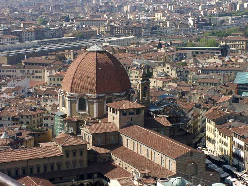 1960's postcard At the request of Pope Leo X, a member of the Medici family, Michelangelo supplied designs in white Carrara marble in 1518 for the unfinished facade, but the plans were never implemented, so the bare bricks are still visible and to this day nobody has financed a facade. The tall Renaissance dome is the top of the Cappelle Medicee (Medici Chapels), the most celebrated and grandest part of San Lorenzo. |
