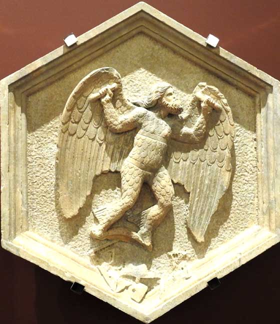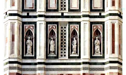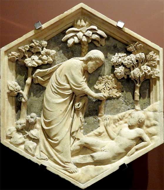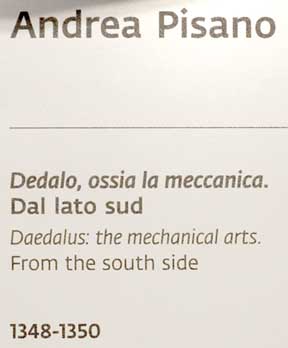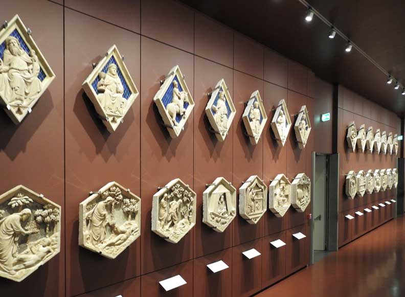 On the Campanile/Bell tower, the hexagonal panels and bas-reliefs set in diamond-shaped lozenges are reproductions ... The originals, as shown above, are on display in the Opera del Duomo Museum: ... The panels depict the Creation of man, Planets, Virtues, Liberal Arts, and Sacraments