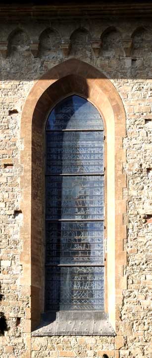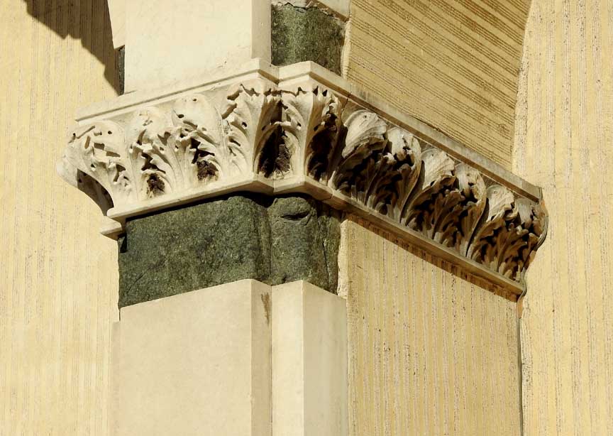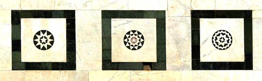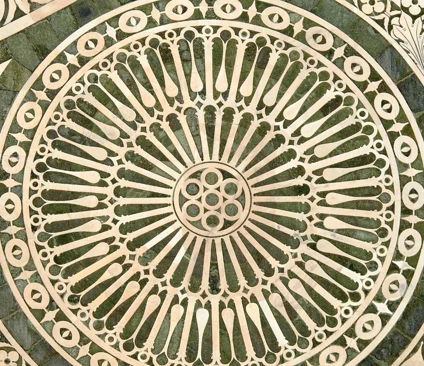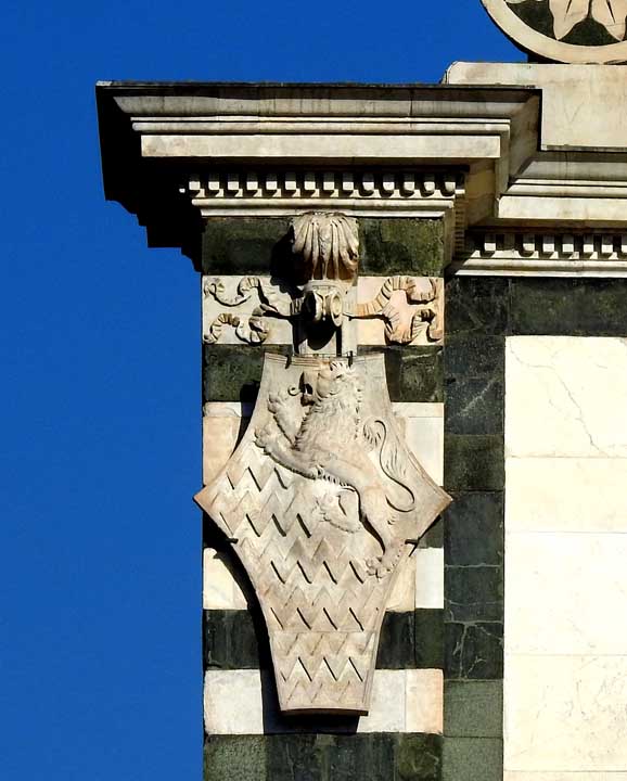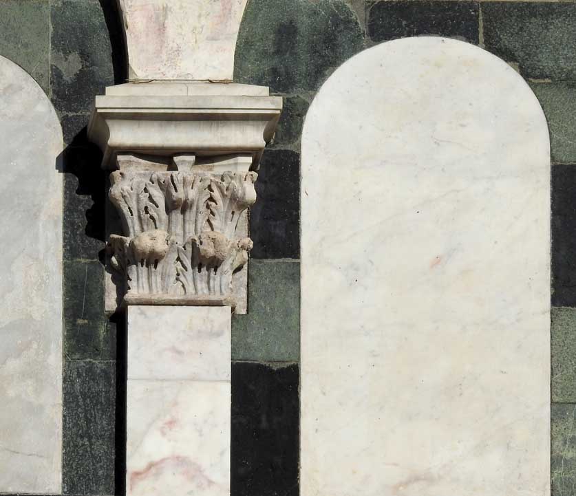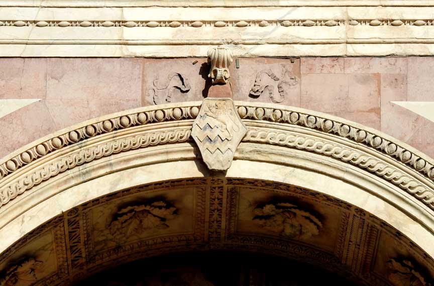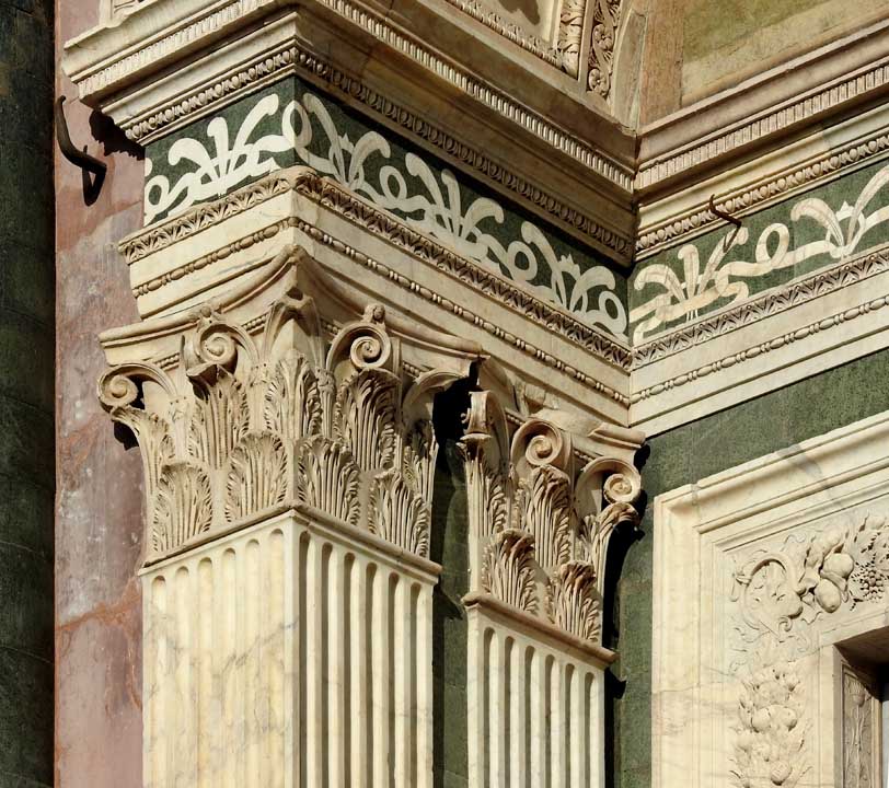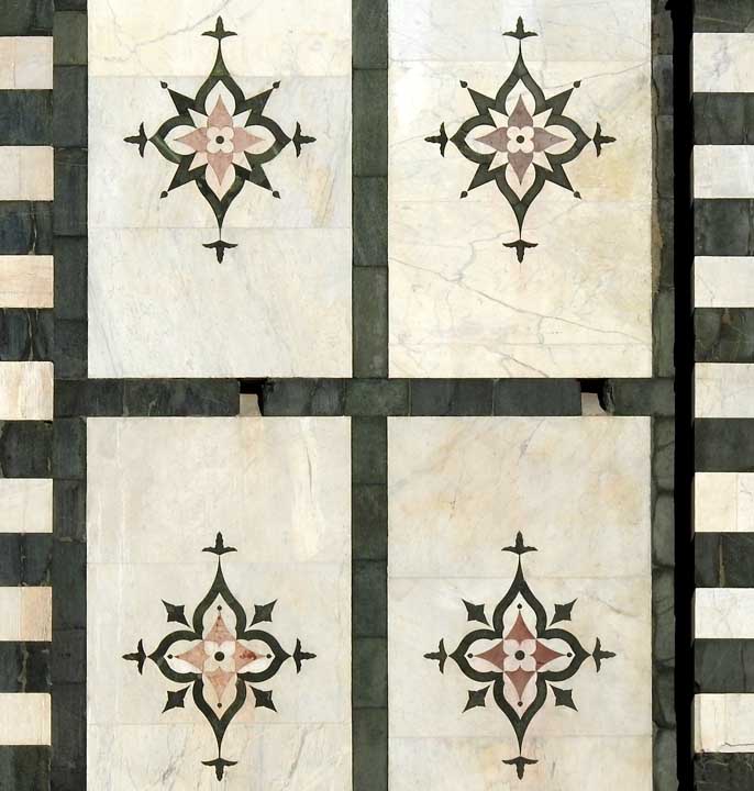 Two details below:![]() Upper facade Rosette deign using inlaid green and white marble ![]() Upper facade ![]() Upper facade Frieze corner: Ribbons and ancone ... Romanesque chevrons ... Lion ![]() Upper facade Frieze , flanked by the corners illustrated just above, features decorated squares ![]() Upper facade Bottom frieze features Rucellai family emblem: billowing sails |