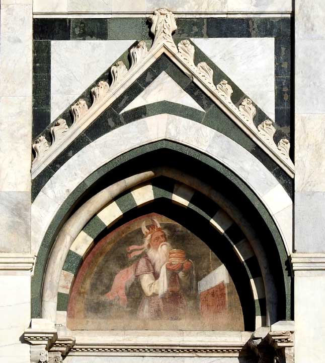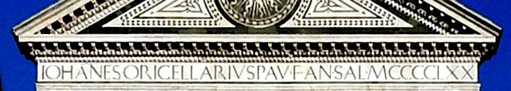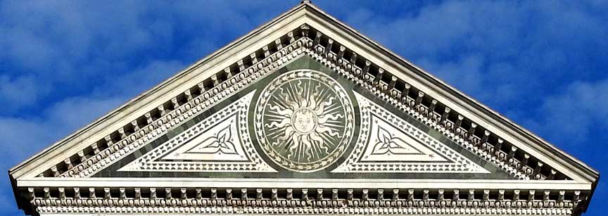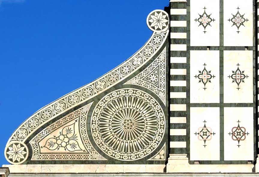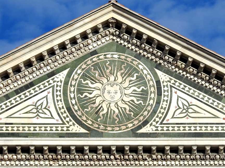 Upper facade - designed by Leon Battista Alberti, 1458-1470 ![]() Upper facade Romanesque bell tower/campanile with tall pyramidal spire behind left scroll buttress ... Inlaid green and white marble ... Top tympanum above frieze which reads IOHANES.ORICELLARIUS.PAV.F.AN.SAL.MCCCCLXX (Giovanni Rucellai. Son of Paolo. Year of Salvation. 1470) ... Flanking scroll buttresses ... Four striped pilasters ... Circular window ![]() Upper facade Triangular pediment ... Tympanum (pediment interior) ![]() Upper facade Tympanum detail: Modillions ... Egg-and-dart molding ... Dentil molding ... Sun face: Dominican solar emblem with the face of baby Jesus ![]() Upper facade Tympanum detail: Modillions ... Egg-and-dart molding ... Dentil molding ... Spandrel ![]() Upper facade Frieze text, in Latin: IOHANES.ORICELLARIUS.PAV.F.AN.SAL.MCCCCLXX (Giovanni Rucellai. Son of Paolo. Year of Salvation. 1470). ... See explanation ABOVE on this page ![]() Upper facade One of two scroll buttresses, two "ears" decorated with rosettes of inlaid marble on either side. ... The buttresses solve a longstanding architectural problem: How to transfer from wide to narrow storeys ... Churches all over Italy draw their origins from the design of this church. ... "Today