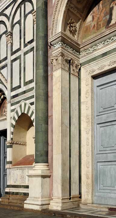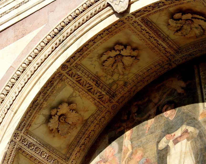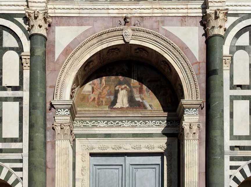 base![]() Rectangular base - finished by Talenti in Gothic style in 1357 Between 1458 and 1470, Leon Battista Alberti added two striped end columns, four dark green engaged columns, ... Three portals ... Three lunettes above the doors painted by Ulisse Cocchi ... In 1360, a series of Gothic arcades were added to the facade; these were intended to contain sarcophagi. ![]() Rectangular base ![]() Rectangular base One of five pilaster Corinthian capitals ![]() Rectangular base Left lunette over portal : ... The three lunettes above the doors were painted in 1616 by Ulisse Cocchi. ... Crockets ![]() Rectangular base Corinthian capitals ![]() Rectangular base The three lunettes above the doors were painted in 1616 by Ulisse Cocchi. This central one shows St. Thomas Aquinas (1225-1274), a Dominican friar ![]() Rectangular base Romanesque chevrons and lion ... Bead-and-reel molding ... Guilloche molding ![]() Rectangular base Coffered soffit features rosettes ... St. Thomas Aquinas mural ![]() Rectangular base ... 2008 photo ... Lunette ... St. Thomas Aquinas, a Dominican ![]() Rectangular base ... One of six arcaded funerary niches with pointed Gothic arch ... At the bottom of the niche are emblems and coats-of-arms of the families buried here. ![]() Rectangular base Corinthian columns with (Greek) fluted shafts ![]() Rectangular base ... Emblems and coats-of-arms of one of the families buried in the six niches. |