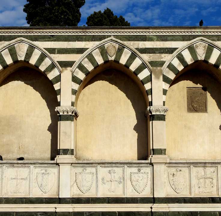and South elevation![]() Cemetery Left: South elevation of the basilica ... Gothic style pointed arches over cemetery niches ... Family emblems at bottom identify the family niche ... "To the right of the church of Santa Maria Novella
