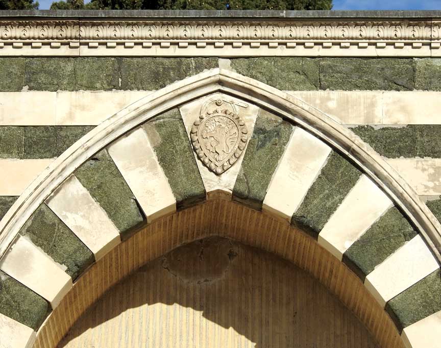 ![]() South elevation Marble facing is reserved for the facade of the basilica ... Two corbel tables detailed below: ![]() South elevation Two corbel tables ... Gothic arch ![]() South elevation Gothic style stained glass window ![]() South elevation Portal employs compound arch surround ... Doors detail below: ![]() ![]() Cemetery Three of eight front arcaded funerary niches ![]() Cemetery Gothic pointed arch ![]() Cemetery Acanthus leaf capital |