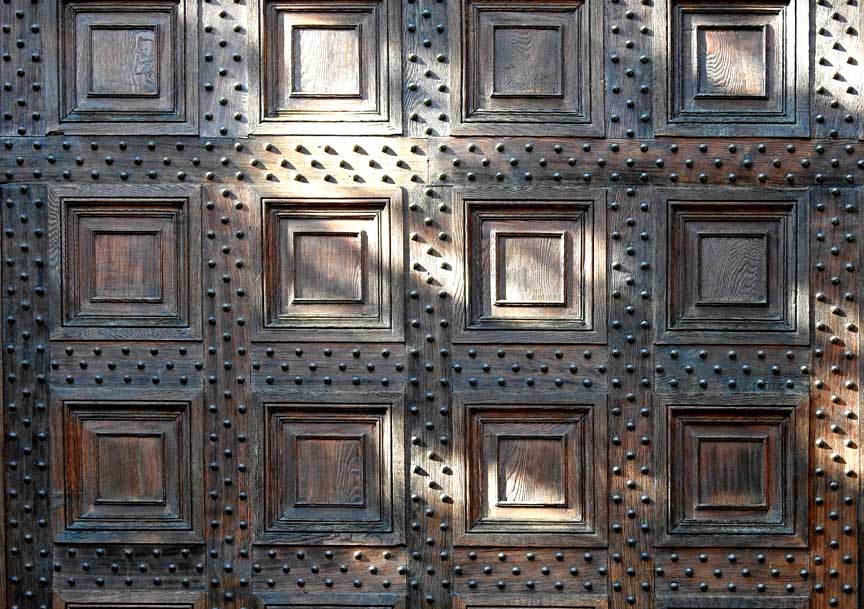 ![]() Romanesque bell tower/campanile with tall pyramidal spire behind left scroll buttress ... The combined facade can be inscribed by a square; many other repetitions of squares can be found in the design. ... Photos below divided by upper facade and rectangular base: |