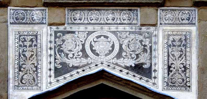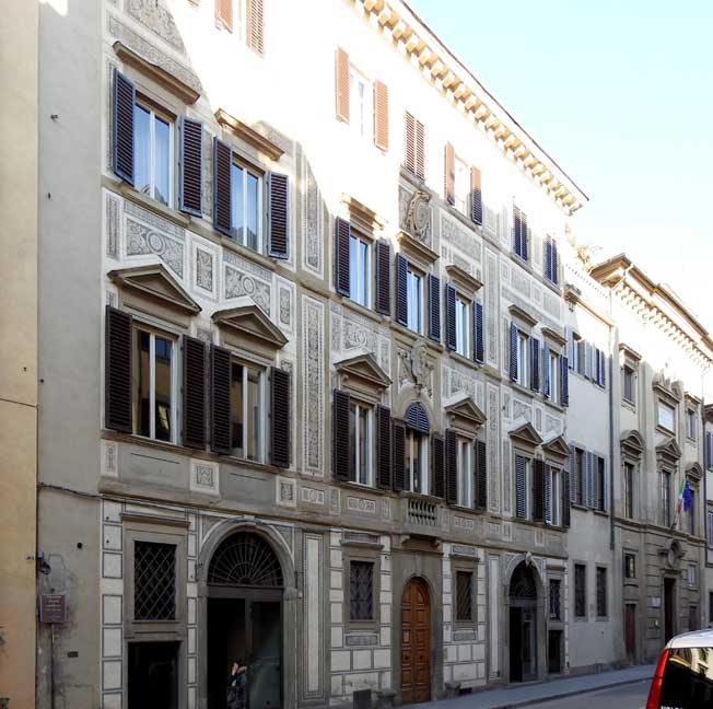 "The building, easily recognizable by the sumptuous graffiti on the facade, was built for the Dardinelli in the late sixteenth century, designed by Santi di Tito. The coat of arms of the family is at the center of the façade, while the higher one is that of Fenzi, who purchased it in the nineteenth century, uniting other great family palace on Via San Gallo." - Wikipedia: Palazzo Dardinelli-Fenzi (online March 2020)