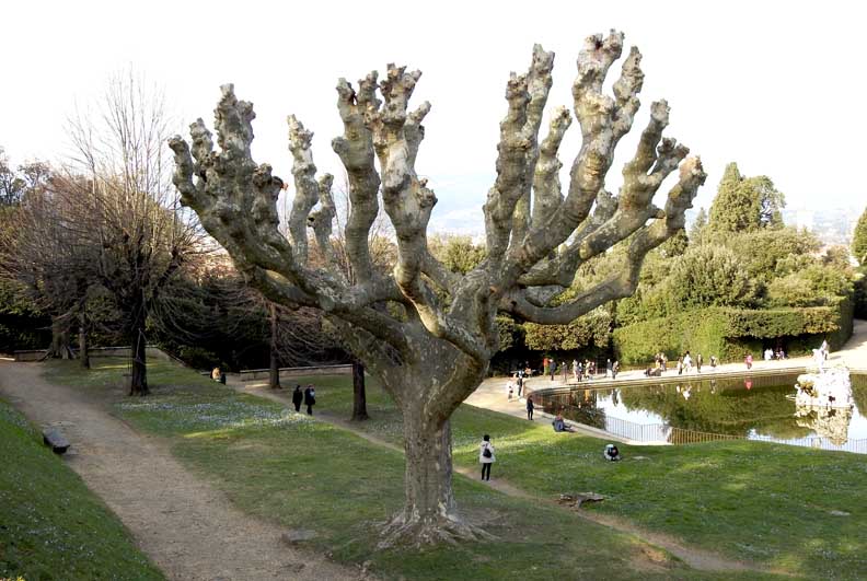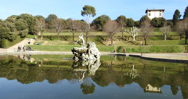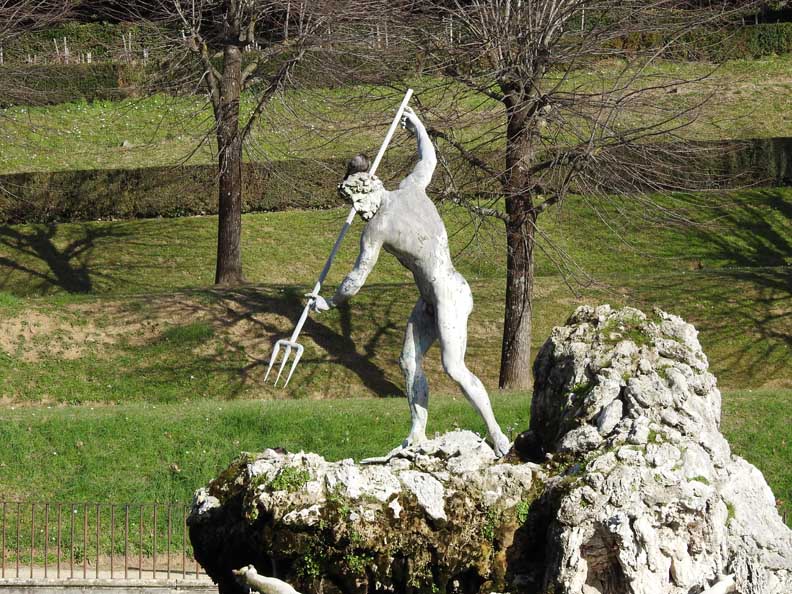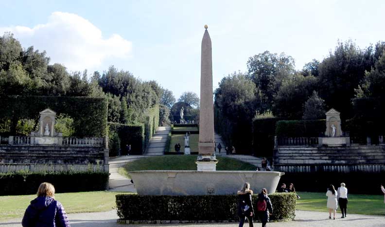 Pitti Palace will be built in that place only forty years later. The landscaping of the garden was commissioned by the Medici family, who had become owners of the building, to Niccolò Tribolo, former architect of the gardens of the Medici villas of Castello and Petraia. However, it was Bartolomeo Ammannati who completed the works after the untimely death of Tribolo. The pietraforte used to build Palazzo Pitti was taken right from the Boboli Gardens: Excavations created a hollow in the ground that still exists today and is clearly visible. Around the main garden axis develop avenues, hedges, terraces adorned with statues and fountains that make Boboli a real open-air museum, but there are also several important buildings that occupy part of the gardens. One of the first buildings is the Amphitheater (Anfiteatro), which opened in 1637. Still overlooks the amphitheater a valuable Egyptian obelisk placed in the gardens by the Grand Duke Peter Leopold, along with a huge vat of gray granite from Roman times. The waters that irrigate the garden are contained in the Basin of Neptune, created in 1777, which houses the Fountain of Neptune (Fontana di Nettuno), called by the Florentines “Fountain of the Fork” (Fontana della Forchetta). |