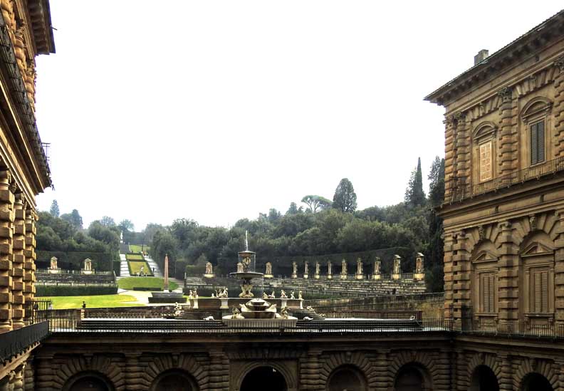 Begun in 1549 and designed by Niccolò Pericoli, known as Tribolo, for Duchess Eleonora of Toledo, the Boboli Gardens are one of the most important examples of an Italian garden. On a hillside behind the [Pitti] Palace, the Gardens are arranged geometrically with a symmetrical, regular positioning of trees and flowerbeds. It was decided to begin the planting of hedges and trees, rare and wild plants and the construction of the fountains immediately. These innovative ideas would make Boboli one of the most significant gardens, worthy of a grand ducal residence. Unfortunately, Tribolo died soon after and the work was taken over first by Bartolomeo Ammannati and then by Bernardo Buontalenti. In 1631 Giulio Parigi transformed the Amphitheater from garden architecture into masonry architecture with the installation, in the first half of the 18th century, of the Egyptian obelisk originally from Luxor but more recently from the Medici’s Roman collections and the basin from the Baths of Caracalla in Rome. The Statue of Abundance, begun by Giambologna and completed by PietroTacca, dominates the whole complex from above. |