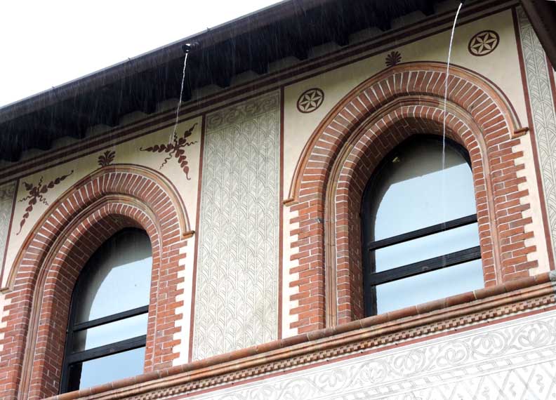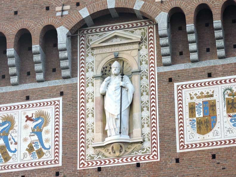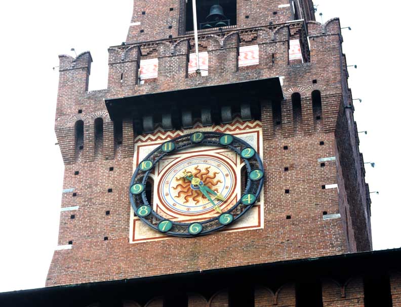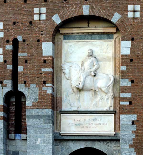 Details below:![]() ![]() Sun motif on clock inspired by the Sforza coat of arms ![]() Machicolation ... St. Ambrose ... Sforza coats of arms ![]() Saint Ambrose ... Sforza coats of arms ![]() Machicolation ![]() Machicolation ![]() ![]() Humberto I, King of Italy between 1878 and 1900 ... The new Filarete tower was dedicated to King Umberto I, assassinated only 5 years earlier in Monza, and inaugurated in a solemn ceremony on 24th September 1905 (MCMV) ... Bas-relief sculpture ![]() Drained moat ![]() Battered foundation ![]() ![]() |