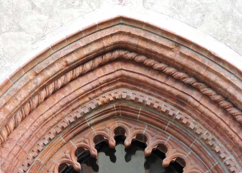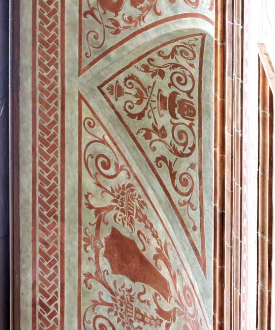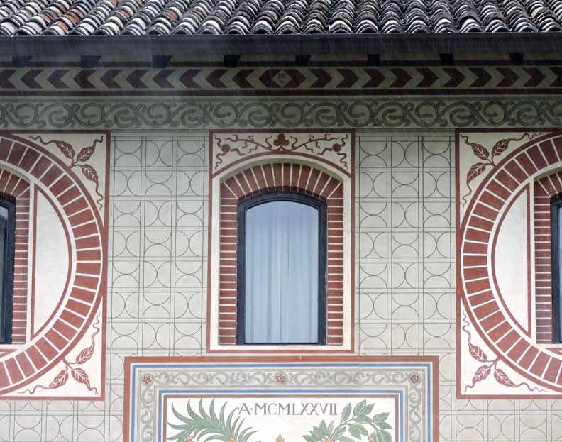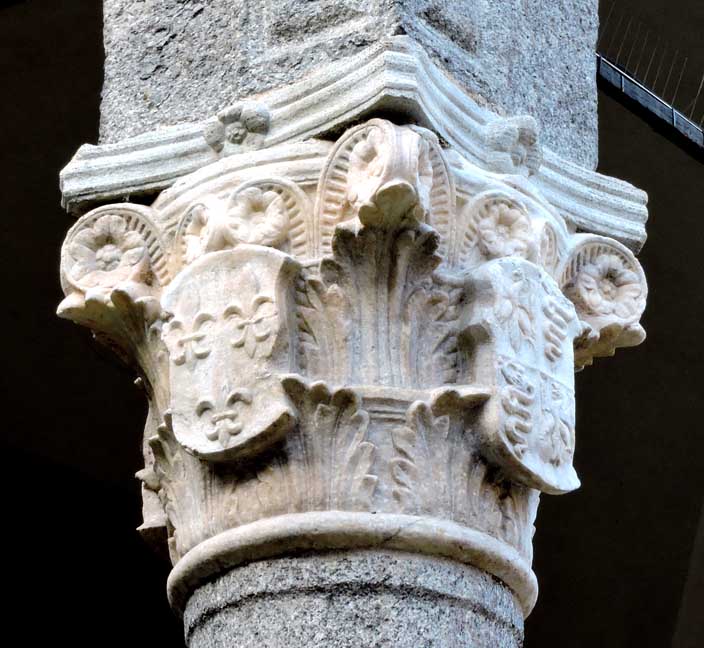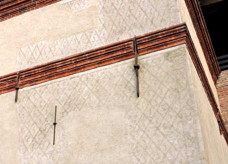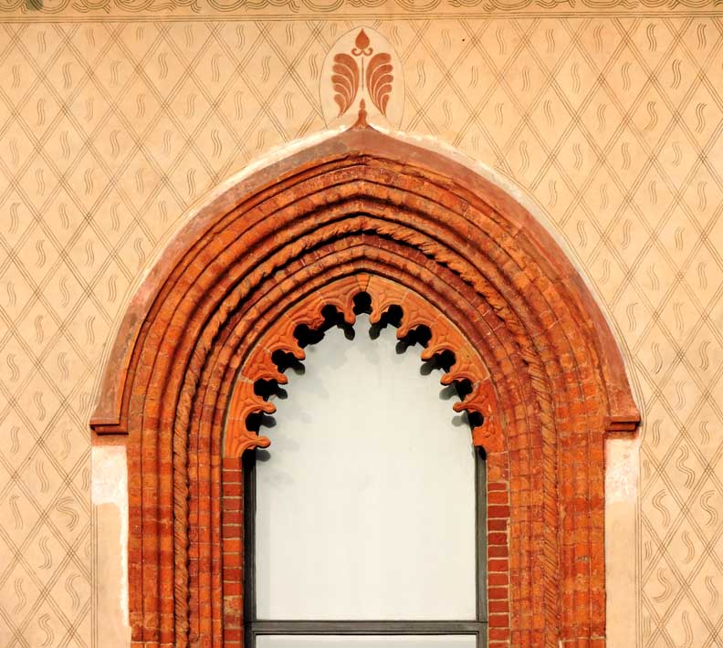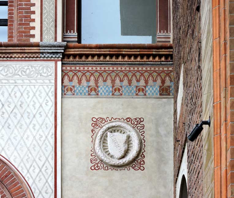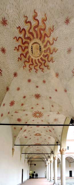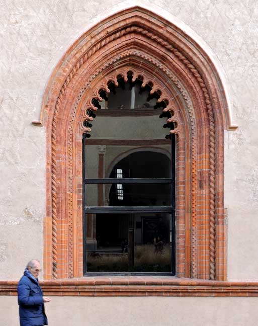 Interior Courtyard ![]() Interior Courtyard. Seven details below: ![]() Interior Courtyard. Detail #1 ![]() Interior Courtyard. Detail #2 ![]() Interior Courtyard. Detail #3: Terra cotta ornamented arcade windows ... Multifoil in tympanum ![]() Interior Courtyard. Detail #4 ![]() Interior Courtyard. Detail #5 ... Terra cotta ornamentation ![]() Interior Courtyard. Detail #6 ![]() Interior Courtyard. Detail #7: Tie rod anchors ![]() Interior Courtyard. Another view below: ![]() Interior Courtyard. Arcaded walkway: View of ceiling in illustration below: ![]() Interior Courtyard. Tie rods ... Four capitals detailed below: ![]() Interior Courtyard. Corinthian capital #1 ![]() Interior Courtyard. Corinthian capital #2 ![]() Interior Courtyard. Corinthian capital #3 ... Volutes and acanthus leaves ![]() Interior Courtyard. Corinthian capital #4 ... Fleurs-de-lis ![]() Interior Courtyard. Window surround detail below: ![]() Interior Courtyard. ![]() Interior Courtyard. Four details below: ![]() Detail #1 ![]() Detail #1 ... Sgraffito ![]() Detail #2 ... Biscione (serpent consuming a human ![]() Detail #3: Terra cotta roof tiles ... Sgraffito ![]() Miscellany ![]() Miscellany: Looking up at a coved ceiling decorated with sgraffito ![]() Miscellany: the Sforza coat of arms includes biscione (serpent consuming a human ... Two details below: ![]() Detail #1 ![]() Detail #2 ![]() Interior Courtyard. Miscellany: Machicolation and terra cotta ornamented windows |
