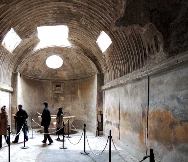 Excerpts from Pompeii Ruins (online April 2013) The "thermae" were the city's public baths. There were relatively few private baths and these were limited to the most well-to-do families, given that the latter were the only ones who could afford to build rooms suited to the purpose. The thermal bath buildings were divided into two sections: one reserved for women and one reserved for men. Each of these contained a series of rooms with different functions: 1) apodyterium or changing room