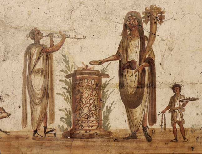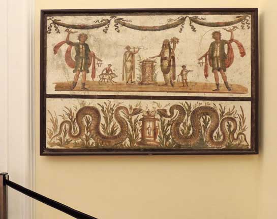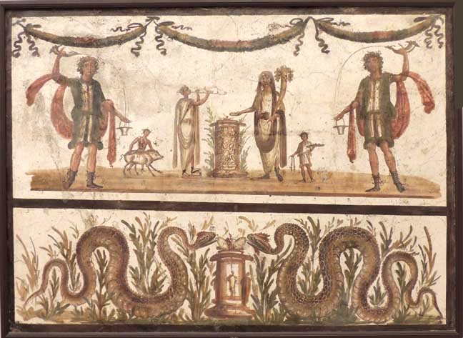 In the upper panel, the lares, the two figures on the sides with drinking horns, are pouring wine into a small bucket. They stand to either side of the sacrifice, carried out by the "genius" assisted by servants and a musician with double-flute. In the lower panel, a pair of snakes, bringers of prosperity and abundance, have reached the offerings of eggs placed on an altar. ![]() The Lares and the Sacrifices Detail - Upper panel Left: One of two lares ... Center: servant (with sacrifice?) ... Right: flutist ![]() The Lares and the Sacrifices Detail - Upper panel Left: Flutist ... altar ... "Genius" ... Right: servant ![]() The Lares and the Sacrifices Detail - Upper panel |