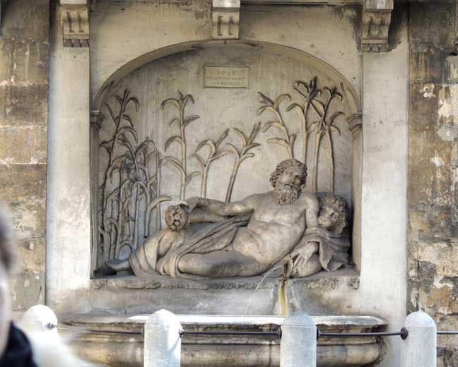River Tiber Note balustrade . round medallion (photos below) ![]() Tiber. Note top of building. San Carlo features columns (close-ups below). The church façade is in travertine and is integrated with that of the monastery. It also curves around the corner and incorporates the pre-existing fountain of the Arno River god. "[Borromini] sets his whole facade in serpentine motion forward and back, making a counterpoint of concave and convex on tow levels (note the sway of the cornices)
