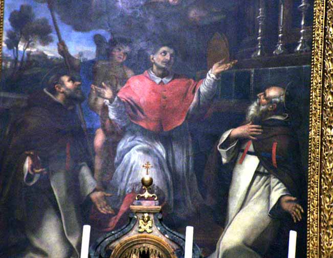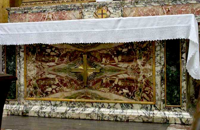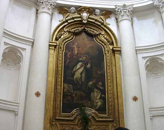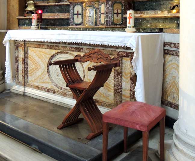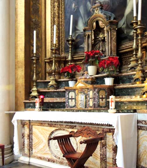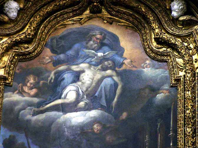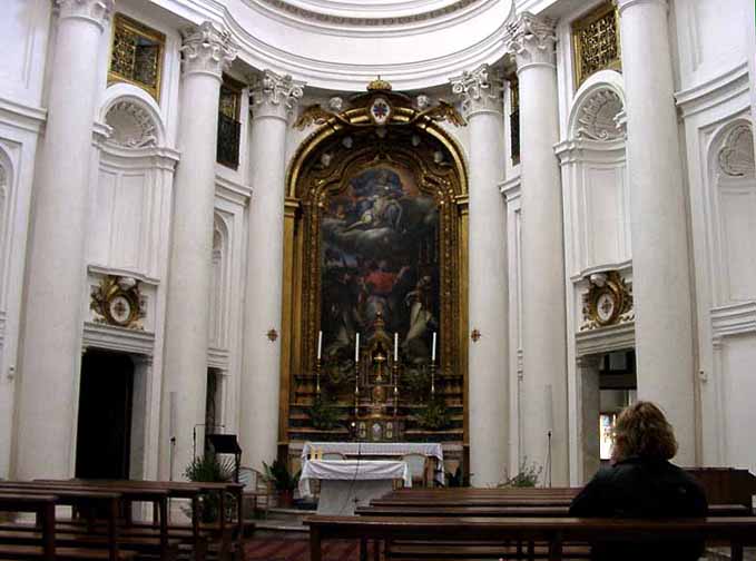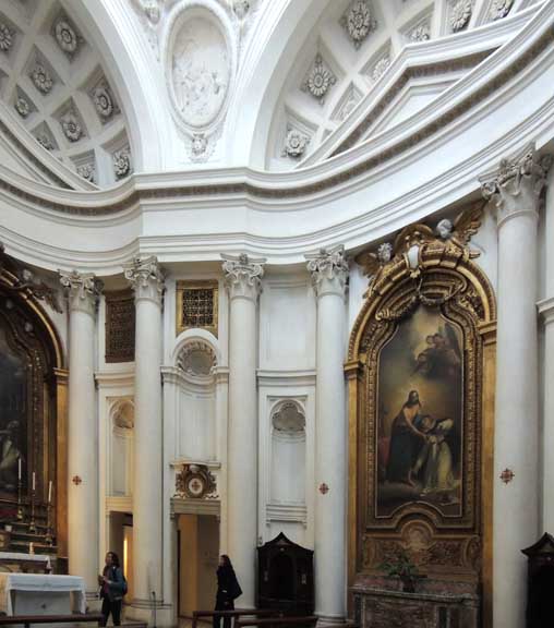 Main altar ![]() Main altar with a semicircular apse above the entablature. ![]() Main altar Coffers feature rosettes ![]() Main altar Note six of the sixteen Roman (smooth shaft) Corinthian columns An oval plan covered by an oval dome. There are no windows at the floor level. The Spanish Trinitarians had vows of poverty and wanted no ostentatious display of materials in the building: no marble revetement, no sumptuous gold or even gold leaf. ![]() Main altar at right. An oval plan covered by an oval dome. This church was designed according to an elliptical plan and aims at giving the illusion of a larger space. The main space of the finished church is only about 30' wide. ![]() Corinthian capital ![]() Main altar. The altarpiece, by Pierre Mignard, has a depiction of Sts. Charles Borromeo, John of Matha and Felix of Valois. The latter two were the founders of the Trinitarian Order. The church has always belonged to the Spanish Trinitarian order of monks ("Discalced", or "shoeless"), an order dedicated to the freeing of Christian slaves. ![]() Main altar Trinity surrounded by angels ![]() Main altar. The altarpiece, by Pierre Mignard, has a depiction of Sts. Charles Borromeo, John of Matha and Felix of Valois. ![]() Marble altar ![]() Main altar Savonarola chair ![]() Main altar |
