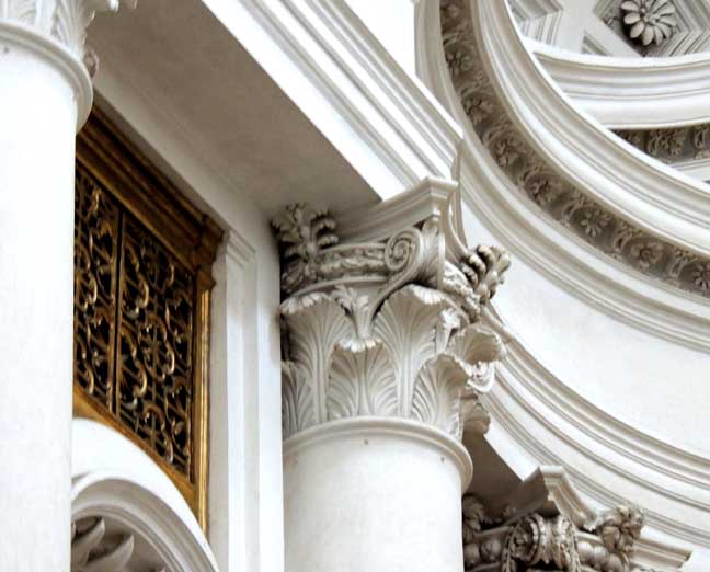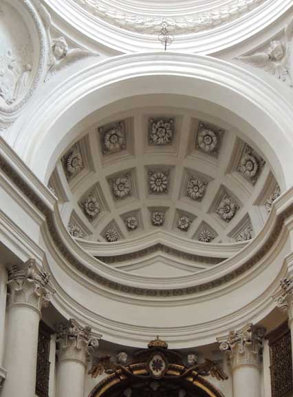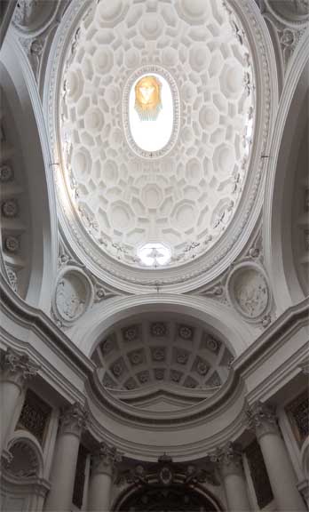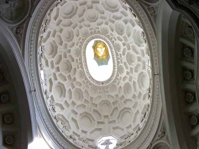 the transition zone of the pendentives and the oval coffered dome with its oval lantern." - Wikipedia (online May 2013) Dome ![]() Deeply coffered, oval dome that seems to float. Note dome center lantern. There are no windows at the floor level. ![]() Octagons, crosses and hexagons. The lantern features the symbol of the Holy Trinity. |