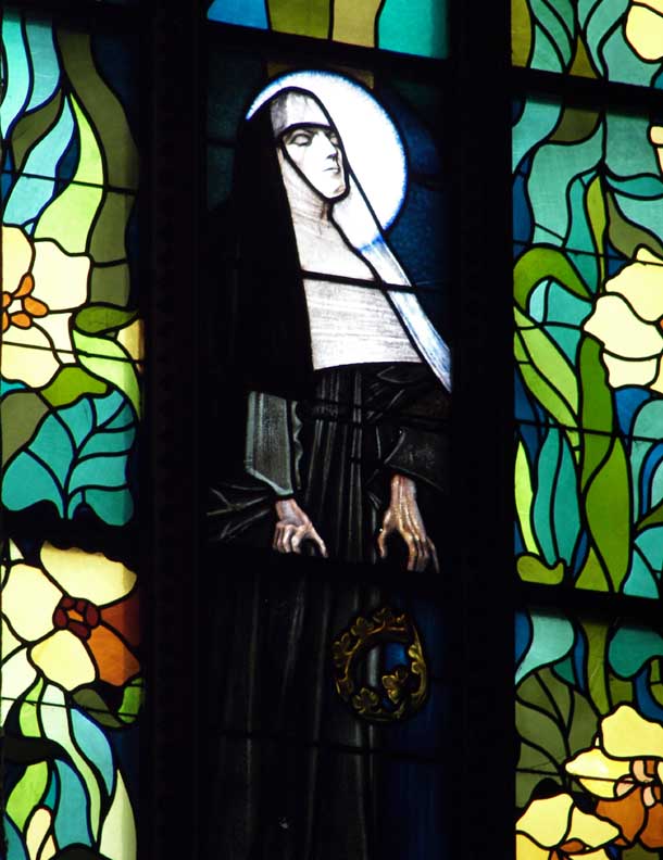 Art Nouveau style: Blessed Salomea stained glass window Blessed Salomea (d.1268) was the wife of the church's founder, Duke Boleslas the Chaste. Like her great nephew, Ladislas the Short, she also had connections with the enchanting Ojcow valley. She finished her days there at Grodzisko, in a convent of her own founding - hence Wyspianski's depiction of her as a Mother Superior. She was canonized in 1673. |