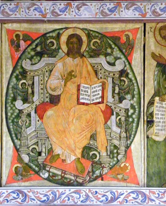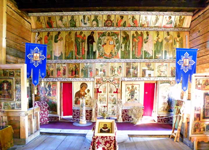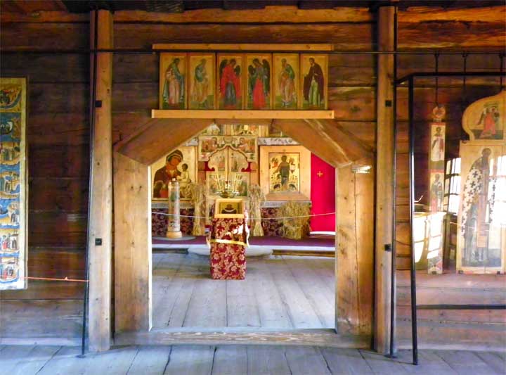 "The iconostasis that is currently displayed was assembled between 1956–1959, and includes Zaonezhye icons of the 17–19th centuries. The icons are set on ... beams ornamented with floral pattern. Some of the original icons mentioned in the inventories for the 19th Century have been lost." - Church of the Intercession - Official Website