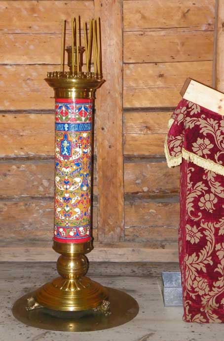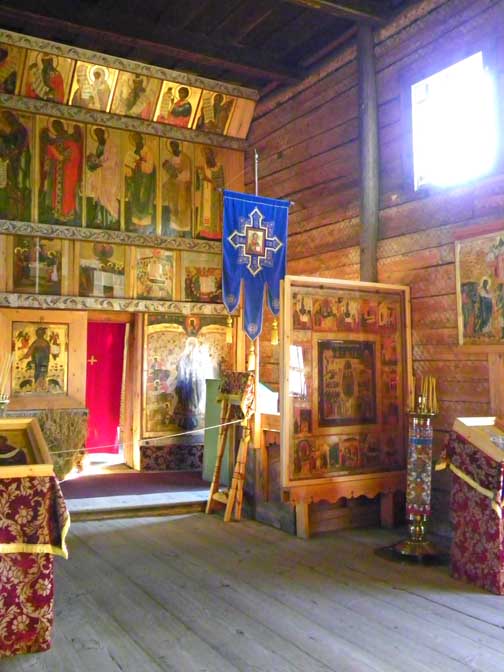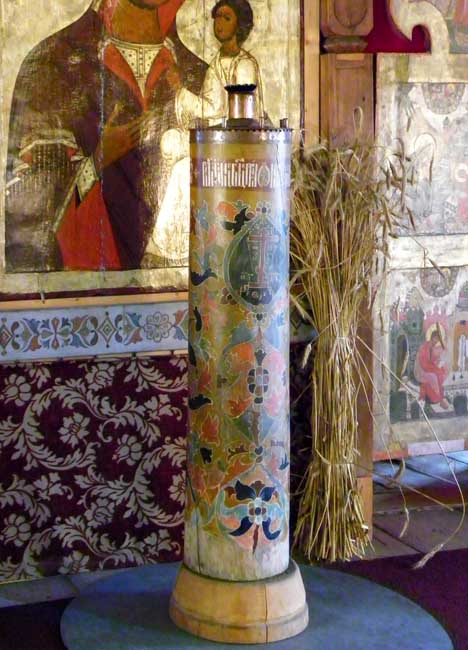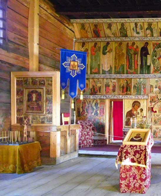 ![]() View of the Church from the Refectory ![]() Center: iconostasis "The iconostasis that is currently displayed was assembled between 1956–1959, and includes Zaonezhye icons of the 17–19 th Centuries. The icons are set on ... beams ornamented with floral pattern. Some of the original icons mentioned in the inventories for the 19th Century have been lost." Church of the Intercession - Official Web Site ![]() The Virgin of Tikhvin icon and floor taper stand ..... Bundled straw on the Royal Doors |