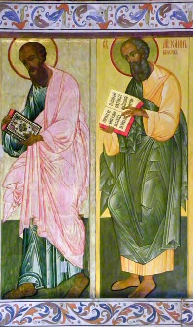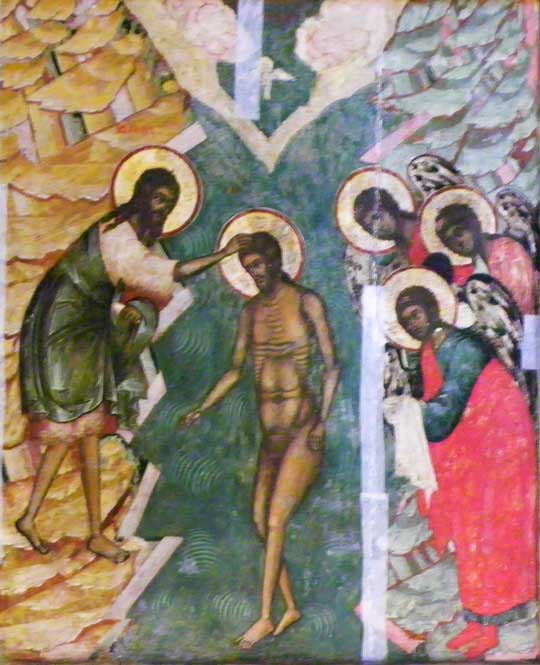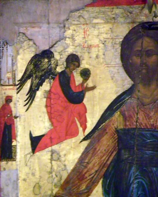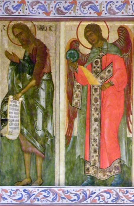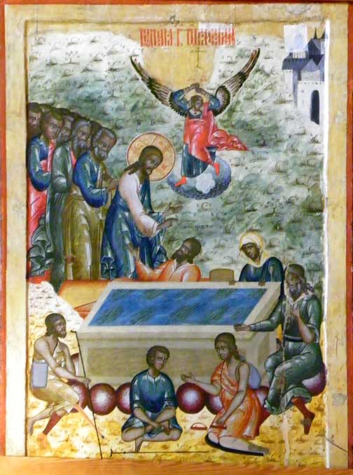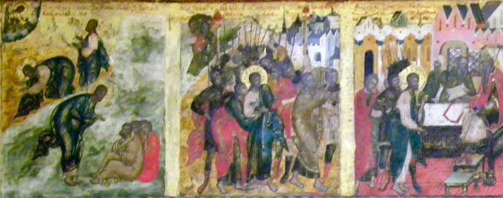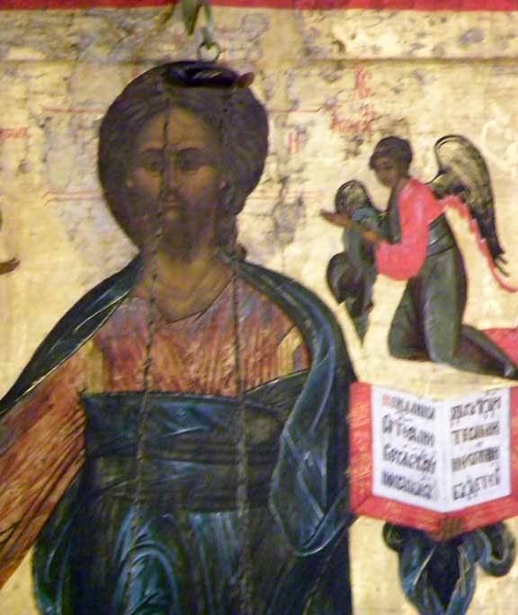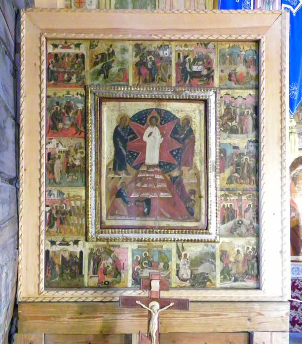 Old Testament prophets who foretold the coming o the Savior through the Virgin Mary. In the center is Mary with the Infant Jesus which testifies that the prophecies have come to pass. Second - Deisis tier Christ enthroned, portrayed as King and Judge (Last Judgment) / Virgin and St. John / Archangels Michael and Gabriel / Apostles Peter and Paul, et.al. Third - Festive tier Church Feasts/ 12 major church festivals Bottom - Local tier Center Royal Gates through which the Eucharist is carried / Jesus to the right of the Royal Doors / Mary to the left of the Royal Doors Some iconostasis details below: ![]() Second tier, center: Christ the Teacher ![]() Second tier, to the right of centered Jesus: St. John the Baptist, Archangel Gabriel ![]() Second tier, middle right: Apostle? and Apostle John (note name in Latin) ![]() 3rd tier: Baptism of Jesus ![]() Third tier: Raising of Lazarus from the Dead(?) ![]() Bottom row, right of Royal Doors ![]() Bottom row, right of Royal Doors |