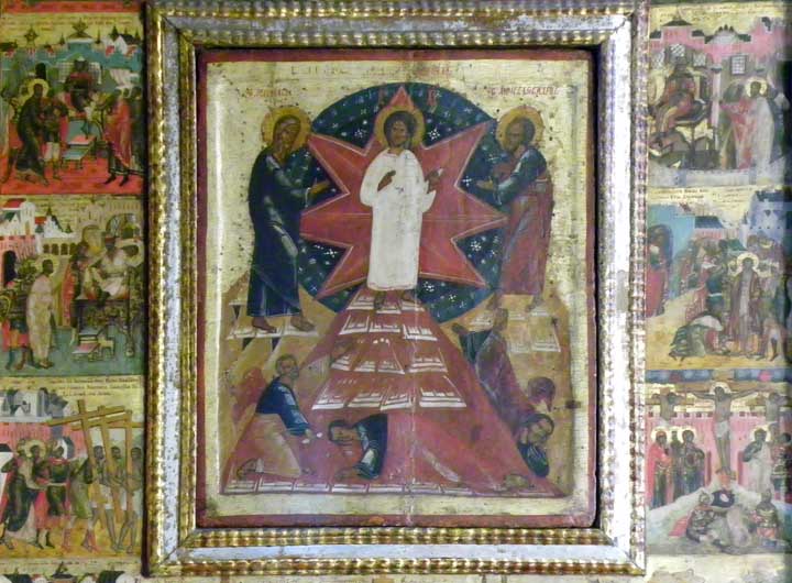 ![]() Note large icon at far left. Details below: ![]() Transfiguration Icon ![]() Top scenes: Garden of Gethsemane ... Capture by the Romans ..... Jesus before Pilate ![]() Center: The Transfiguration |